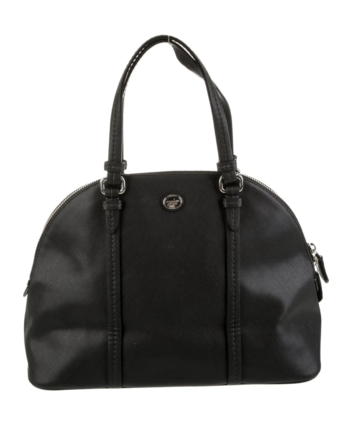 Made of high-quality Saffiano or refined leather with a black exterior. The bag has a sleek, modern dome shape with double top handles and a zip-top closure.