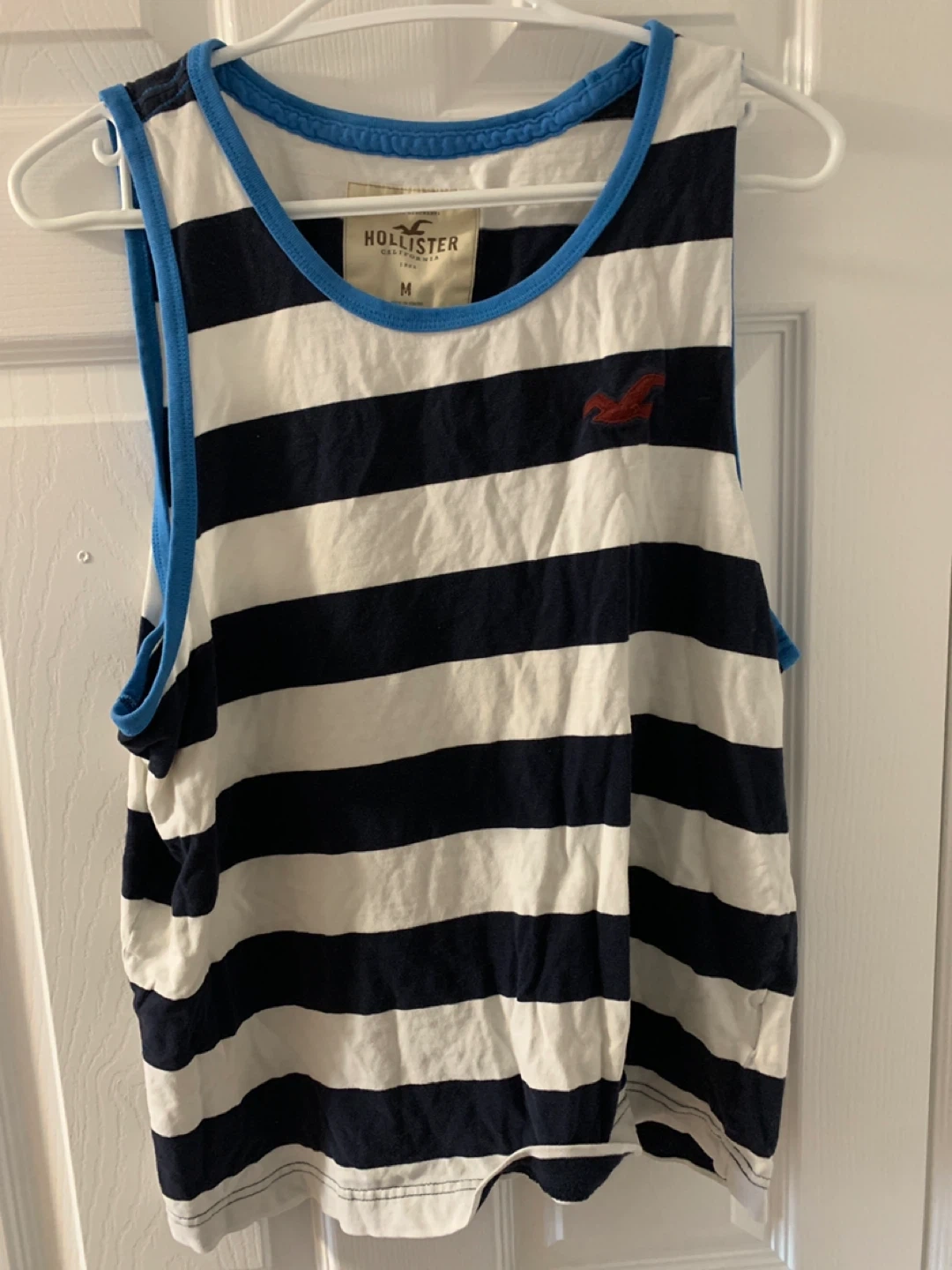 Selling a Hollister tank top in a classic striped design! The colours are white and navy blue, with a bright blue trim around the neck and armholes. It's a size medium and in great condition. Perfect for summer!