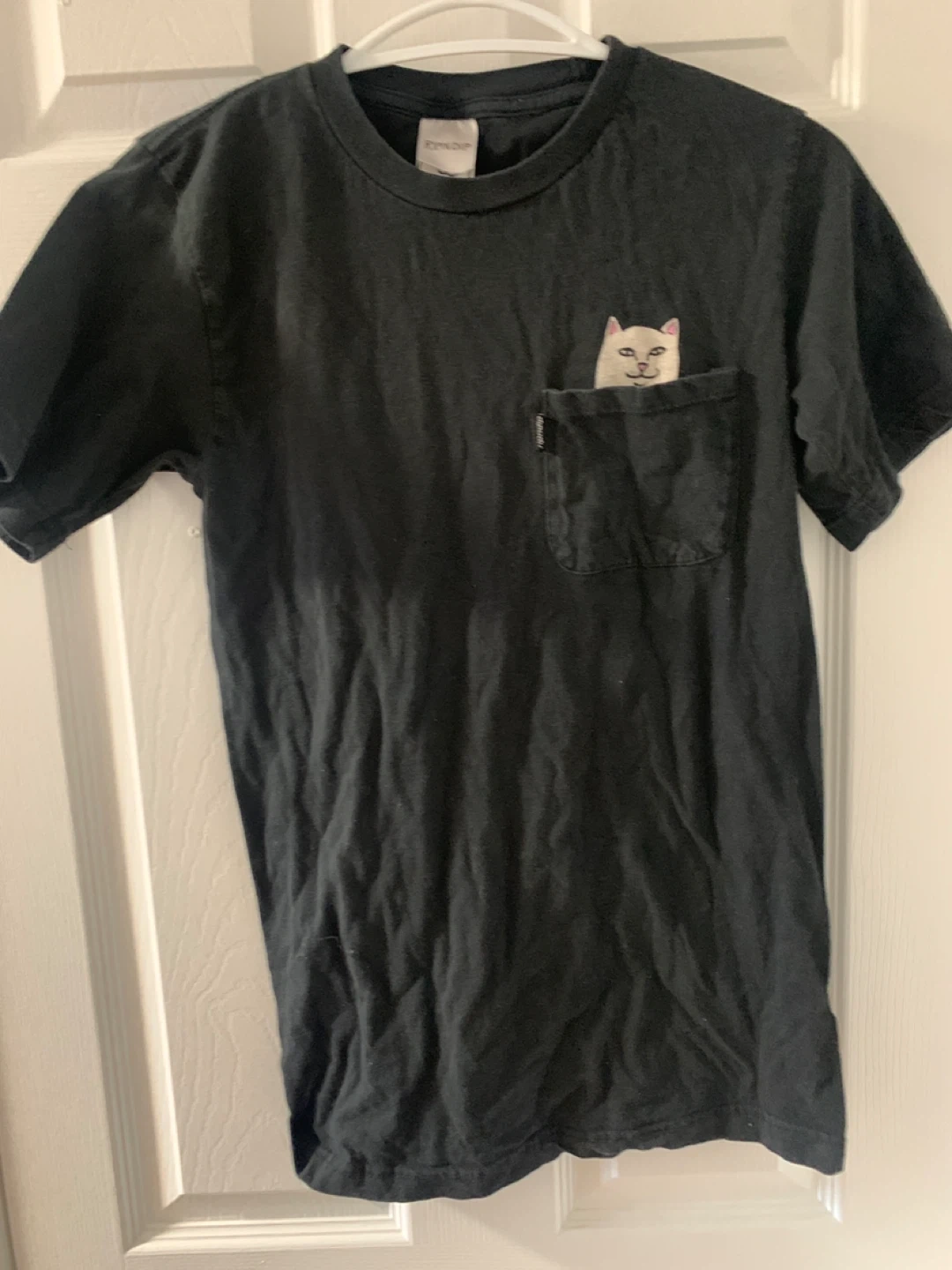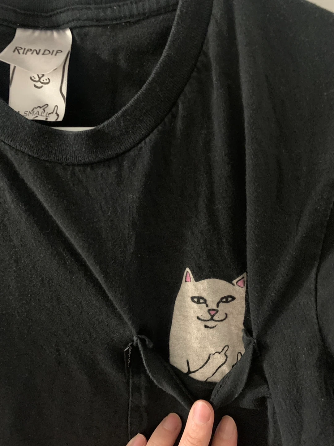 Selling a Ripndip black t-shirt in size small! It features the iconic Ripndip cat design on the pocket. Great for casual wear and showing off your unique style