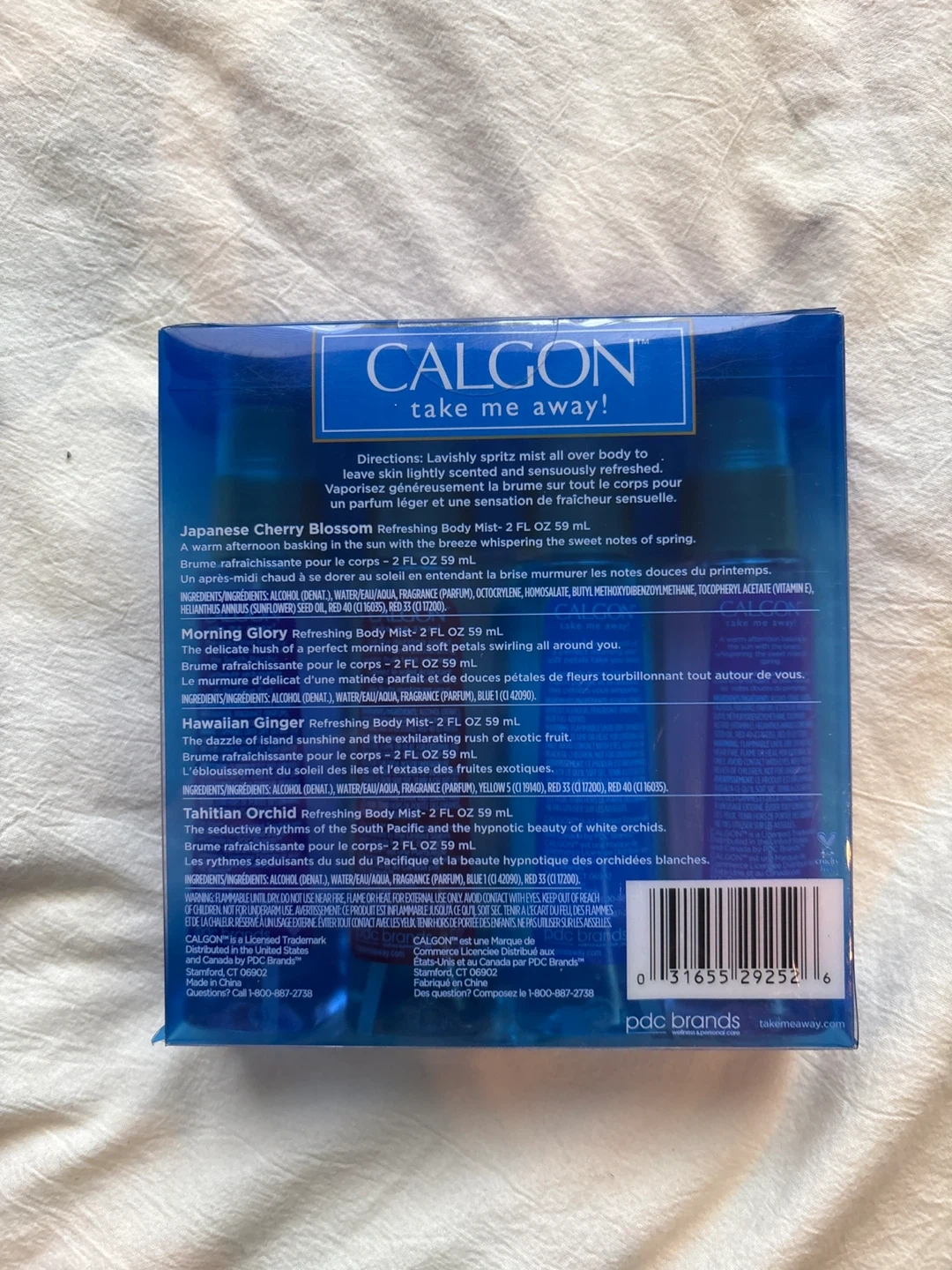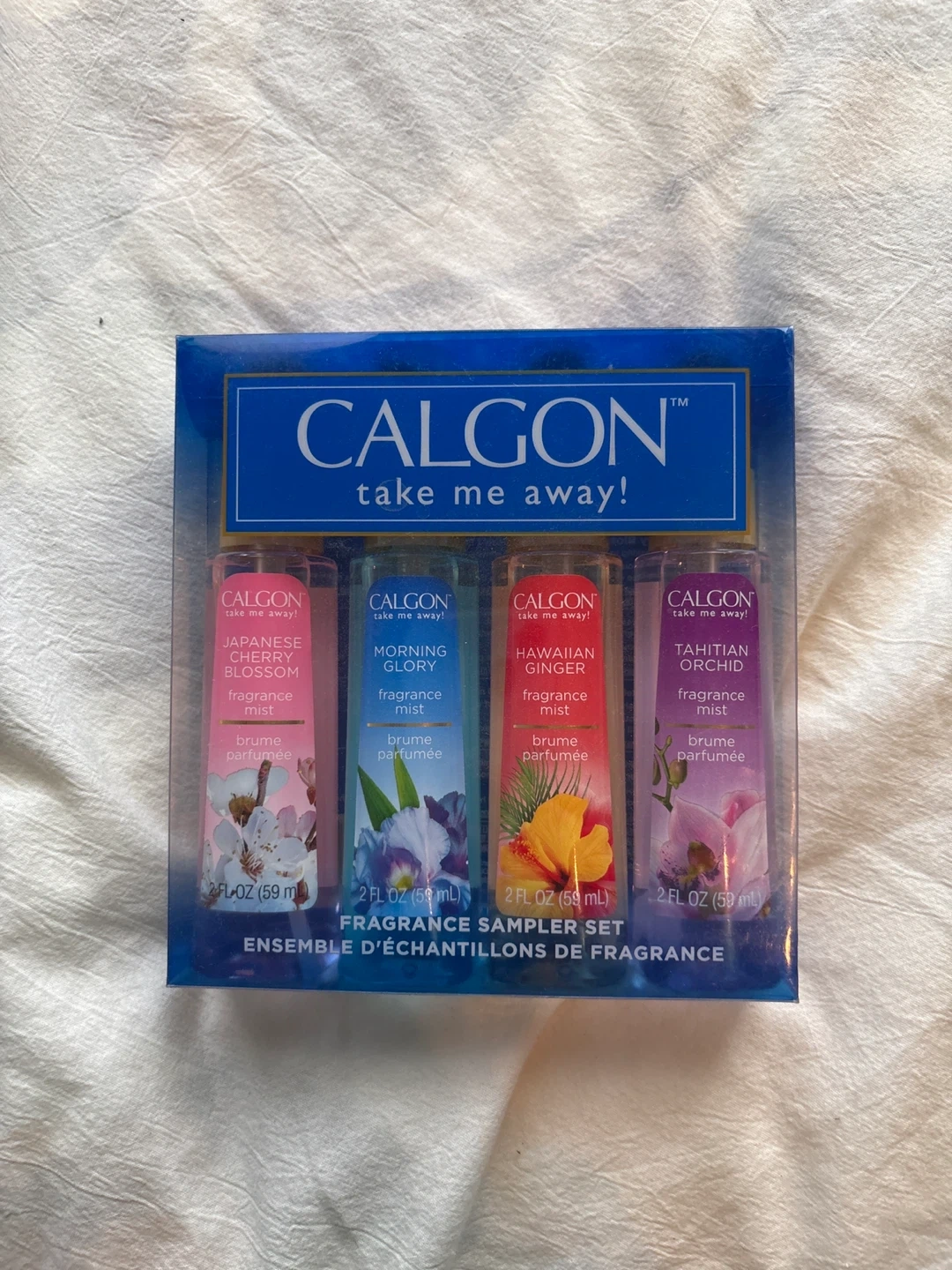 Selling a Calgon Take Me Away! Fragrance Sampler Set. It includes four different scents: Japanese Cherry Blossom, Morning Glory, Hawaiian Ginger, and Tahitian Orchid. Each bottle contains 2 fl oz (59 mL). Great for trying out new fragrances or for travel
