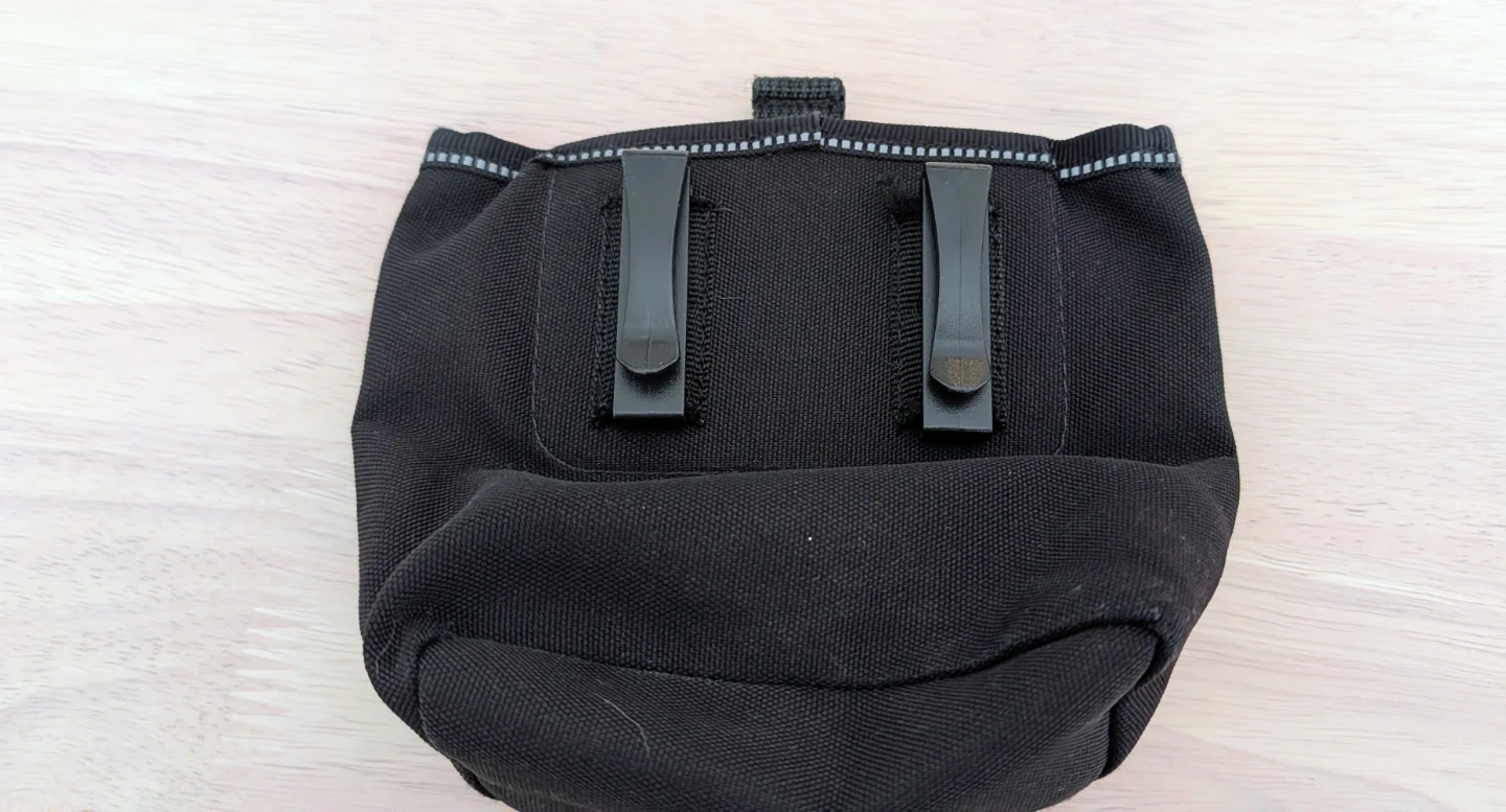 Here's a handy black dog treat pouch! It's perfect for training or just rewarding your furry friend on walks. It has a zippered pocket and clips for attaching to your belt or leash