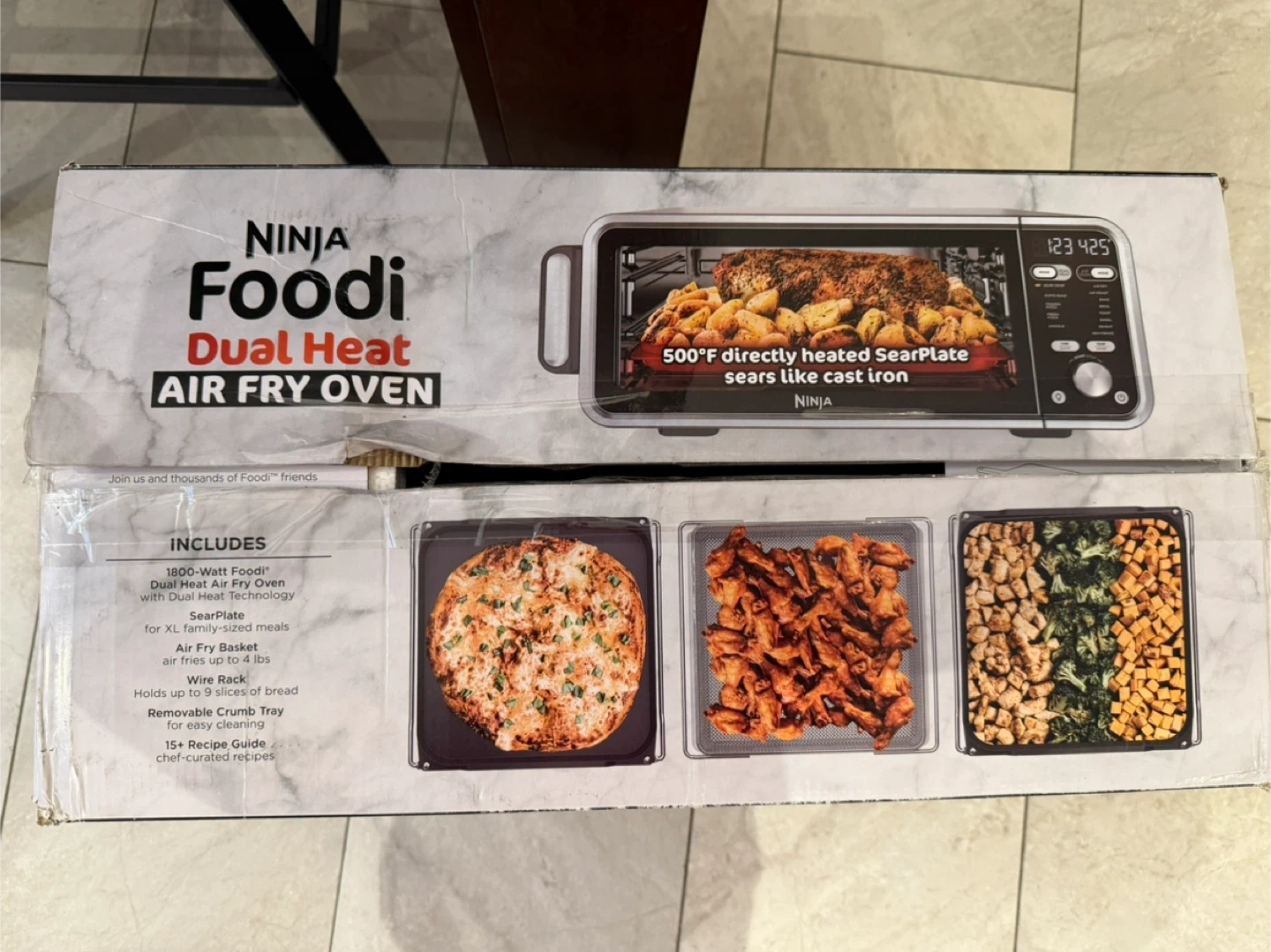 Selling a Ninja Foodi Dual Heat Air Fry Oven. This oven sears, crisps, and flips up and away for easy storage. It has a dual heat system and can reach 500°F directly heated SearPlate temperatures. It features 13-in-1 functions including bake, roast, toast, and more. It has an XL family-sized capacity perfect for cooking for a group