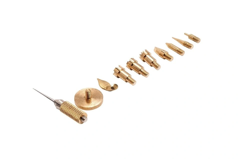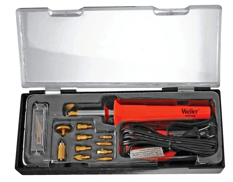 Includes a 25W iron, 9 wood burning tips, an embossing tip, a hot knife tip, and a plastic kit box.