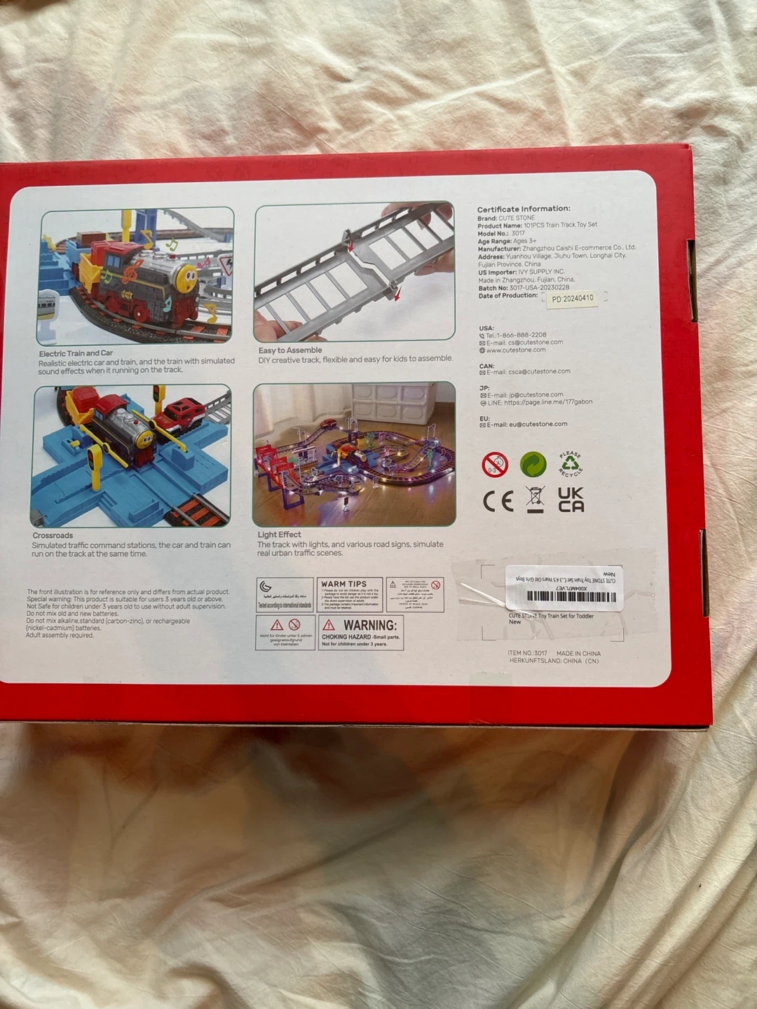 This is a Cute Stone 101PCS Train Track Toy Set for toddlers aged 3+. It features an electric train and car, easy to assemble DIY creative track, light effects, and various road signs to simulate real urban traffic scenes. The box is included