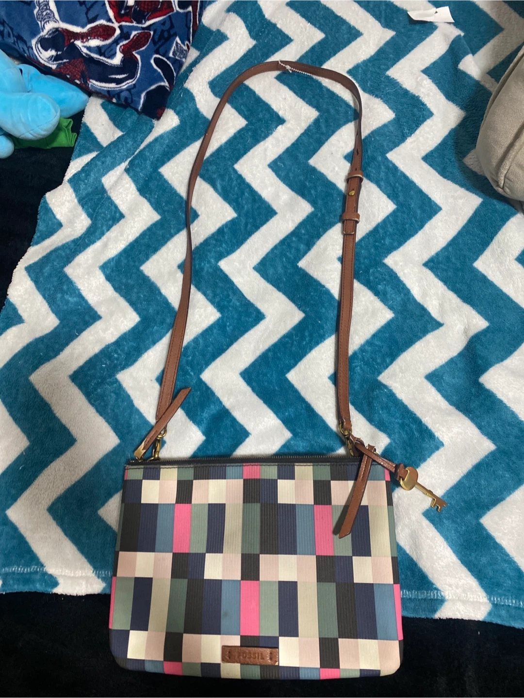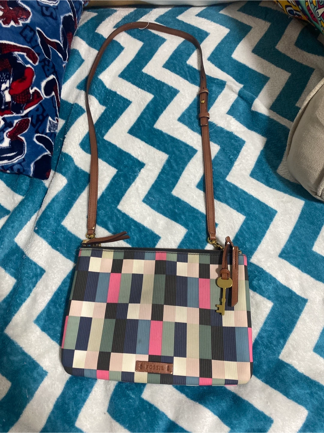 Stylish Fossil crossbody bag with a unique geometric pattern! It's perfect for carrying your essentials while adding a pop of colour to your outfit. The bag is in great condition and ready for a new owner pick up cash only