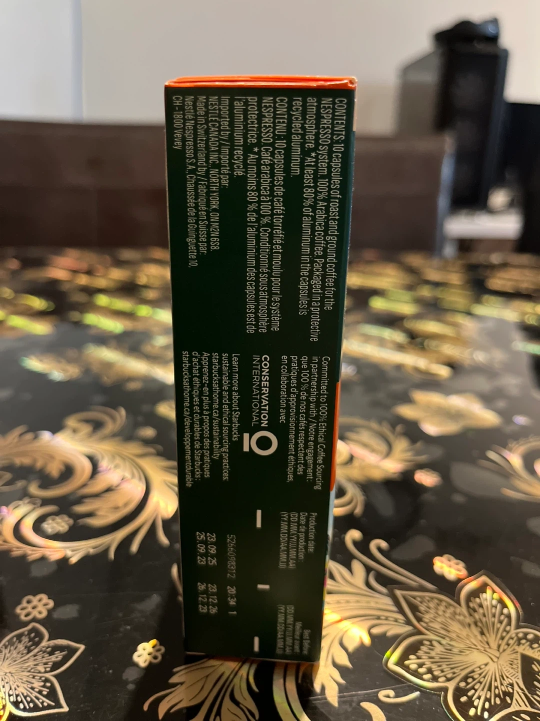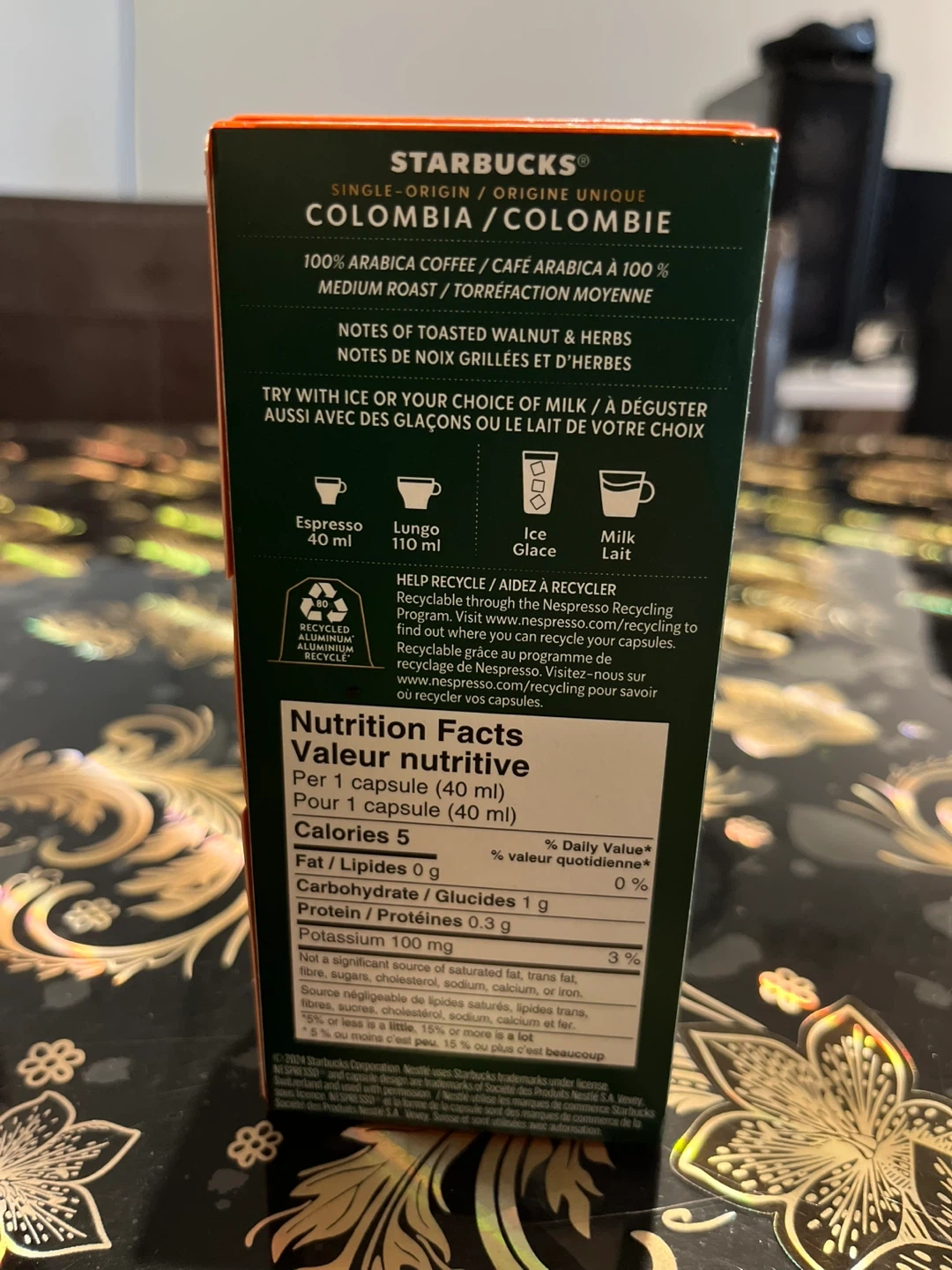 Selling per box of Starbucks Single-Origin Colombia Nespresso capsules. Each box contains 10 aluminum capsules of ground coffee. Perfect for your Nespresso machine! Enjoy the taste of 100% Arabica coffee with notes of toasted walnut and herbs. Best before 2025 December 25