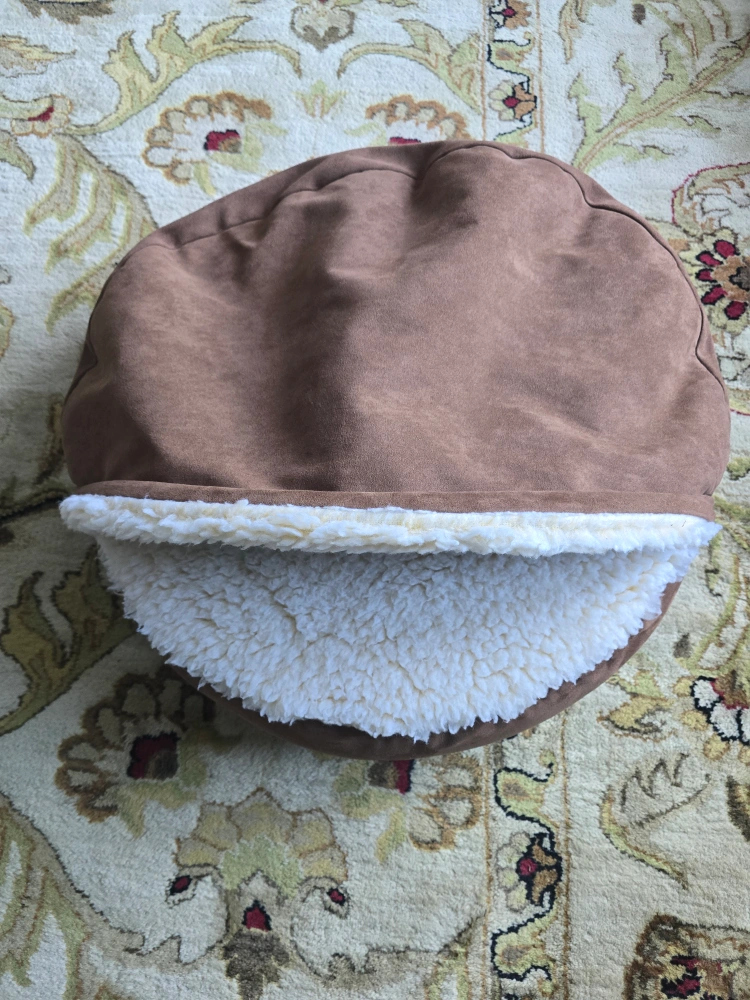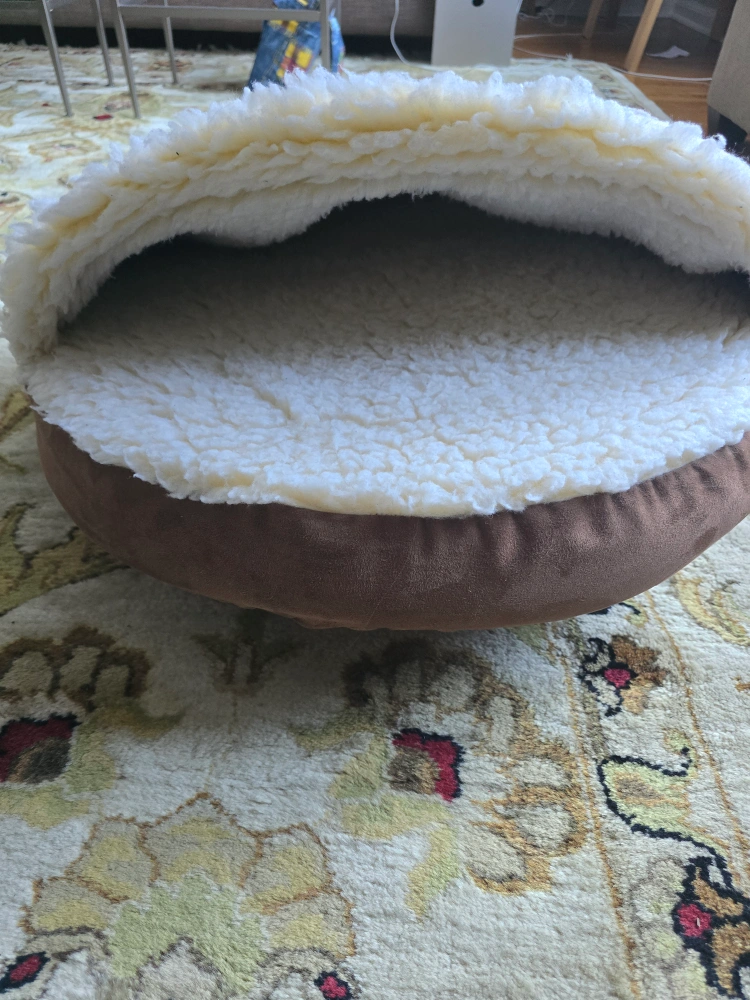 Selling a cozy brown round pet bed! It has a soft, plush interior that your furry friend will love. It's in great condition and ready for a new home. Perfect for cats or small dogs looking for a comfy place to nap