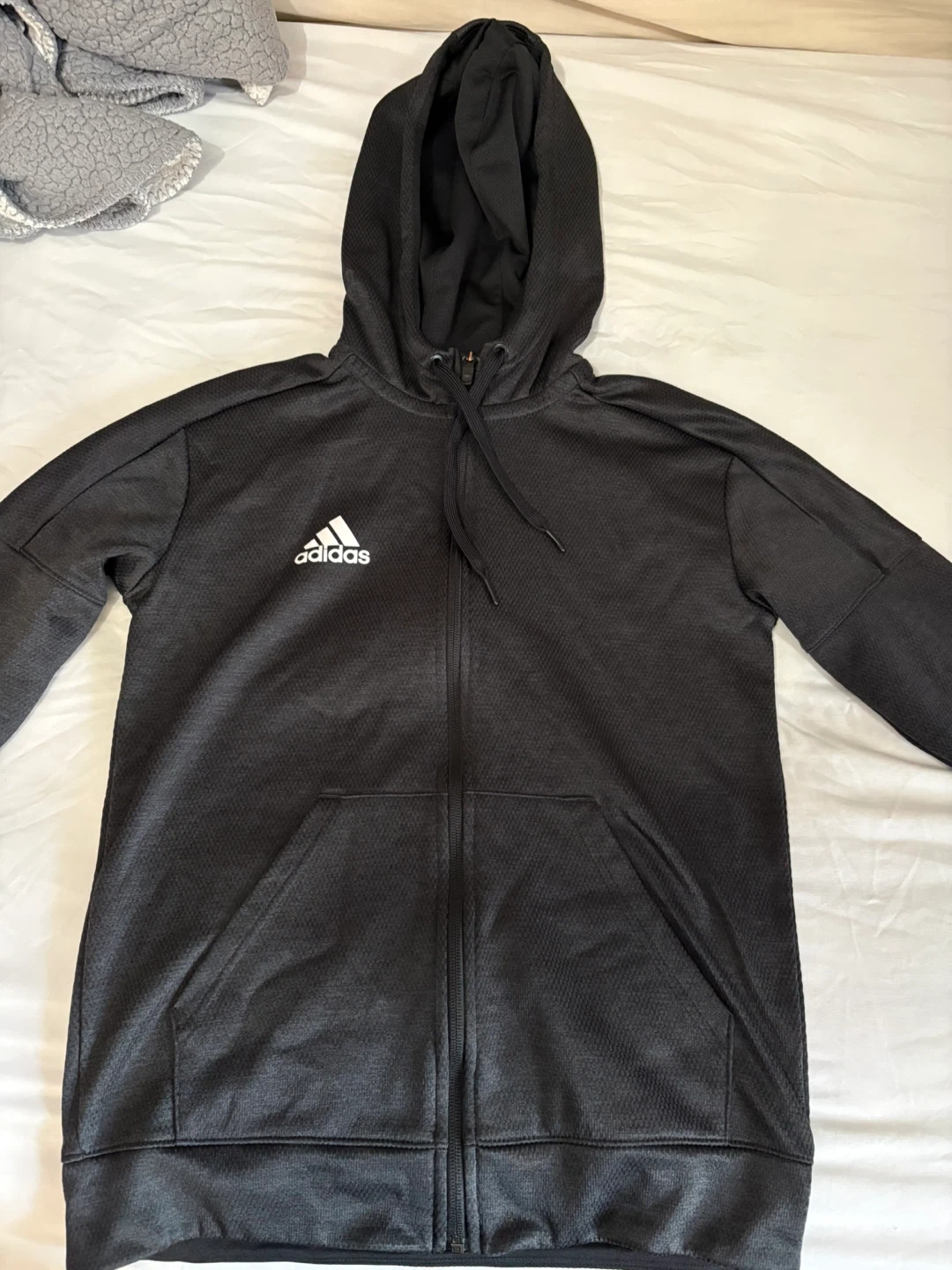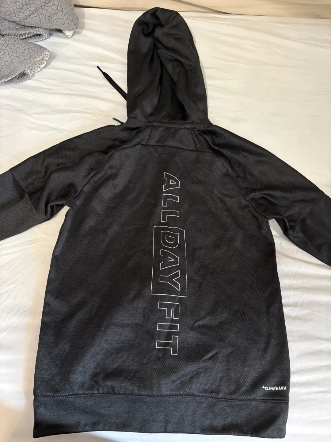 Selling an Adidas All Day Fit ClimaWarm hoodie. The hoodie is black and features the Adidas logo on the front. It also has 'ALL DAY FIT' printed vertically on the back. It's a great hoodie for staying warm during workouts or everyday wear