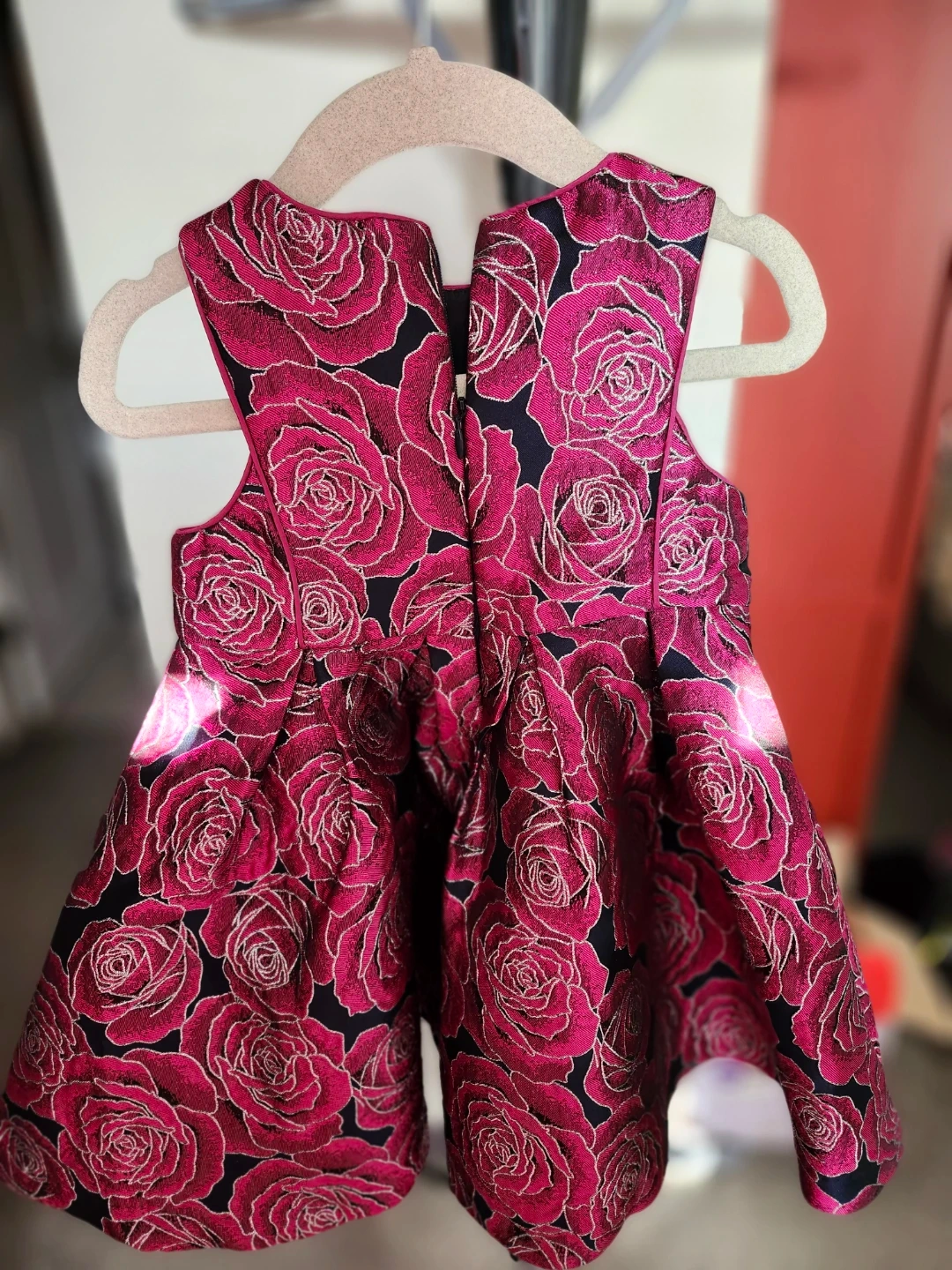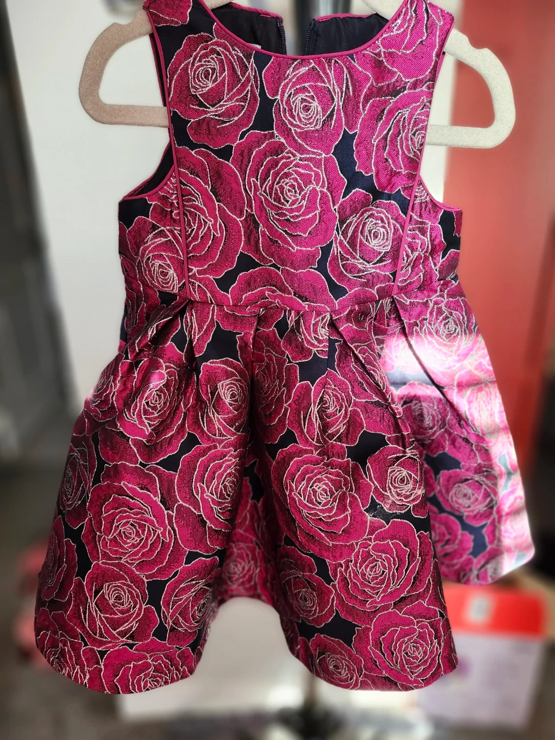 A beautiful Pippa & Julie dress in size 3T! It features a lovely rose pattern in shades of pink and silver on a black background. Perfect for a special occasion or just to make your little one feel extra fancy. Still in perfect condition