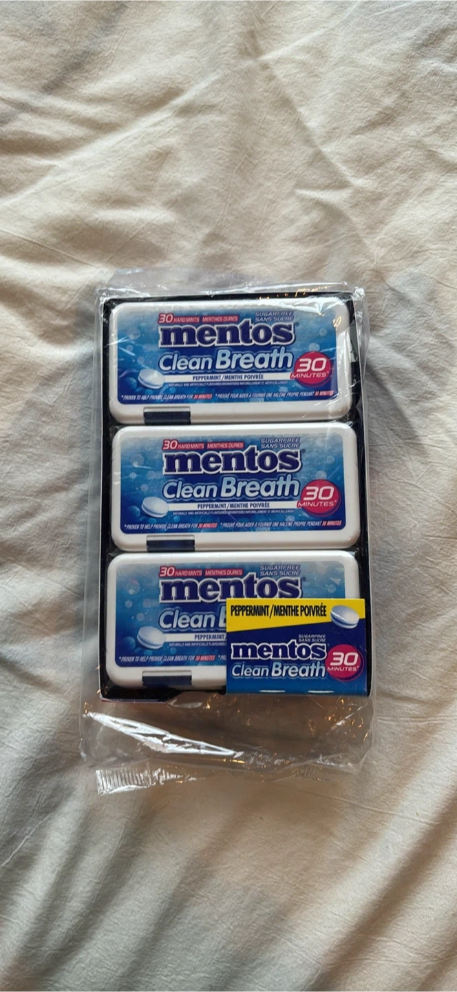 Selling a pack of 12 Mentos Clean Breath in peppermint flavour. Each container has 30 hard mints. These are sugar-free and proven to help provide clean breath for 30 minutes