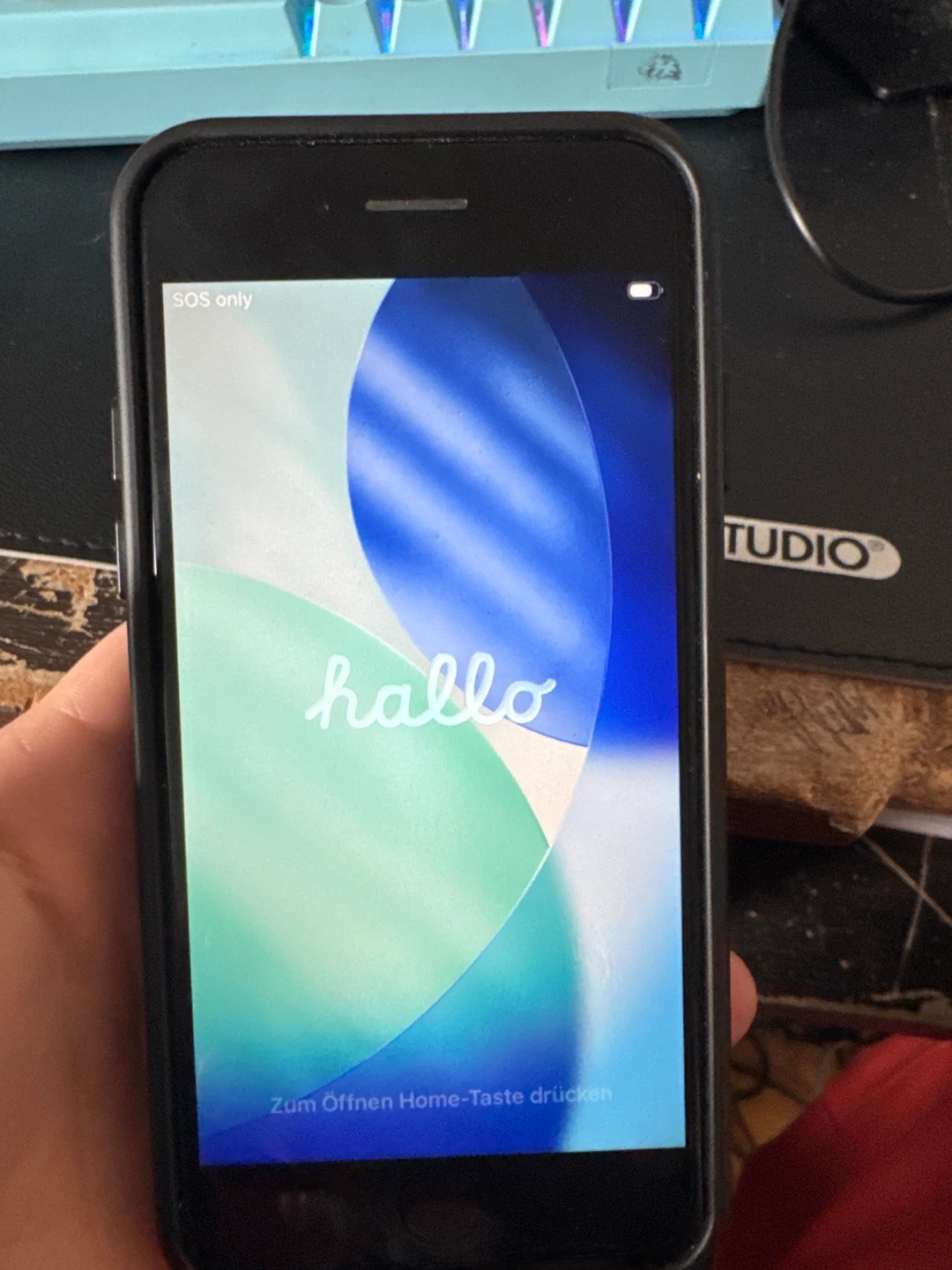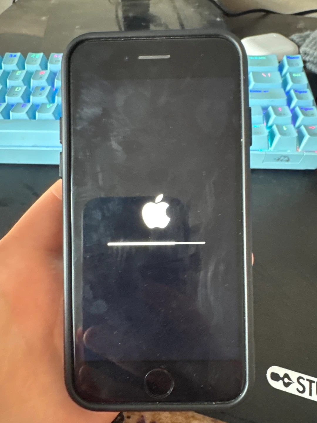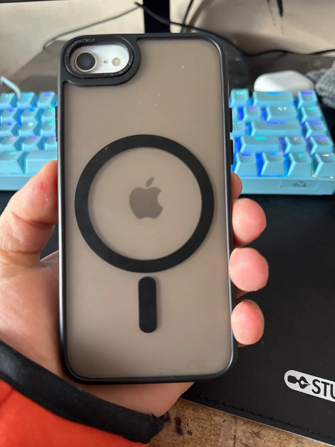 Selling an iPhone SE Second Generation. It has a black case with a MagSafe ring on the back. The phone had free 128G of storage and runs IOS 26