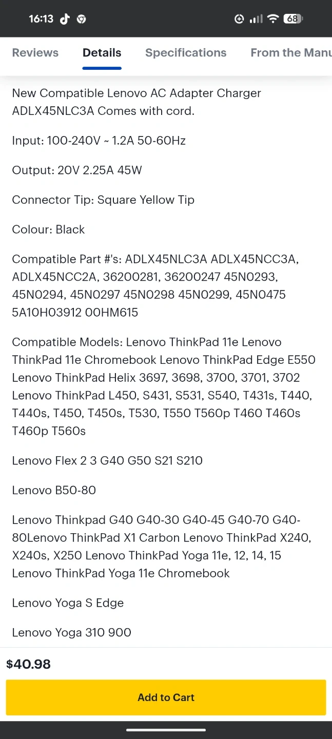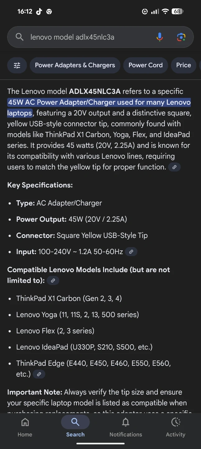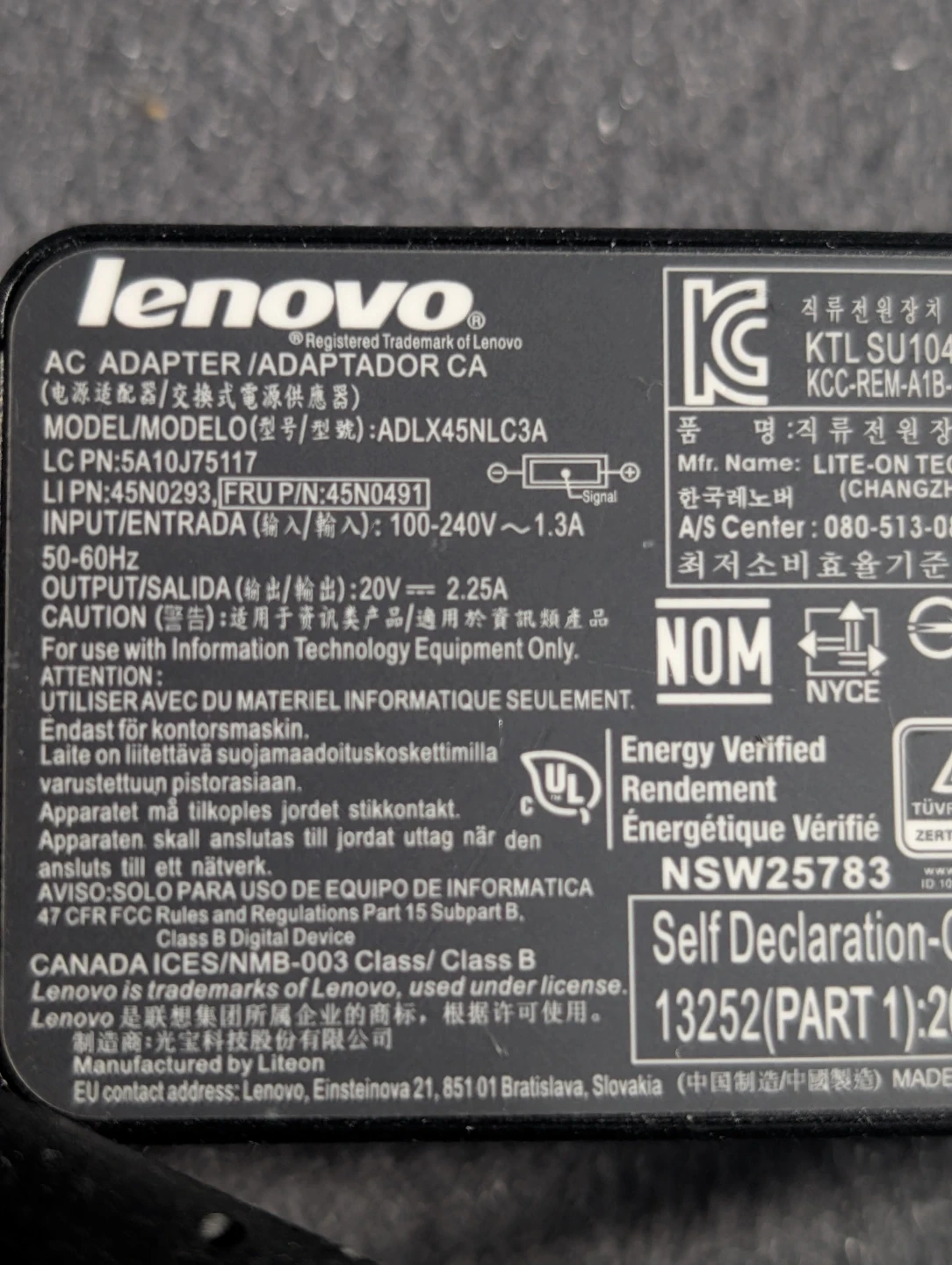 Selling a Lenovo 45W AC Power Adapter/Charger, model ADLX45NLC3A. It features a square yellow tip and is compatible with many Lenovo laptops, including ThinkPad, IdeaPad, Yoga, and Flex models. It has a 20V output and requires users to match the yellow tip for proper function. The power output is 45W (20V / 2.25A) and the input is 100-240V ~ 1.2A 50-60Hz
