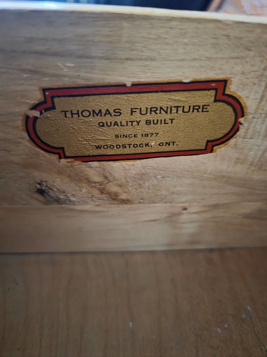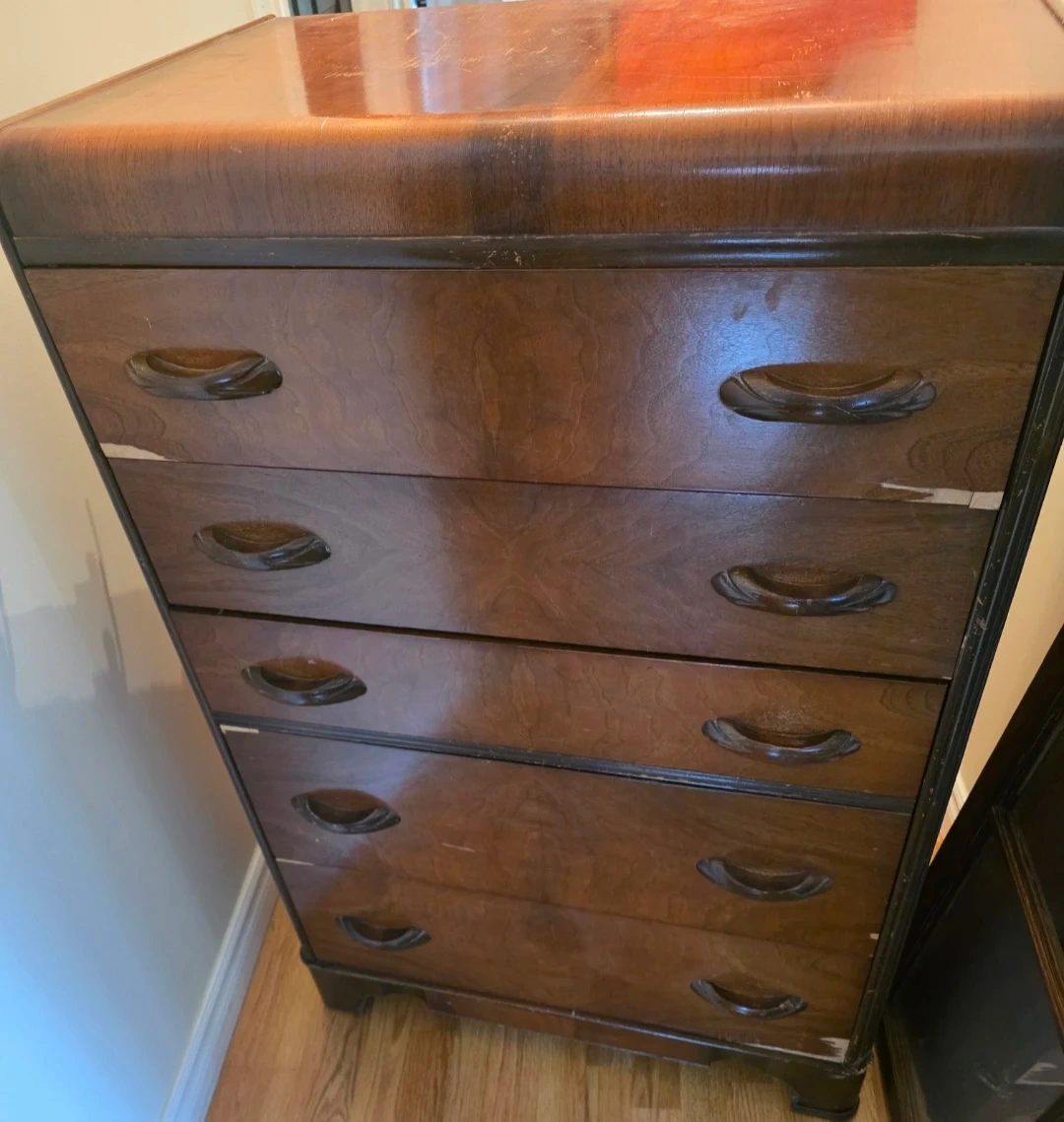 A treasure that was once my grandfathers. I"m renovating and it's time to part with it. Vintage wooden dresser. It has some wear and tear, as shown in the photos, but it's still a solid piece of furniture. The dresser features five drawers, providing ample storage space. Some TLC and it would be a great piece. Purchased by my grandfather at Thomas furniture (see label)