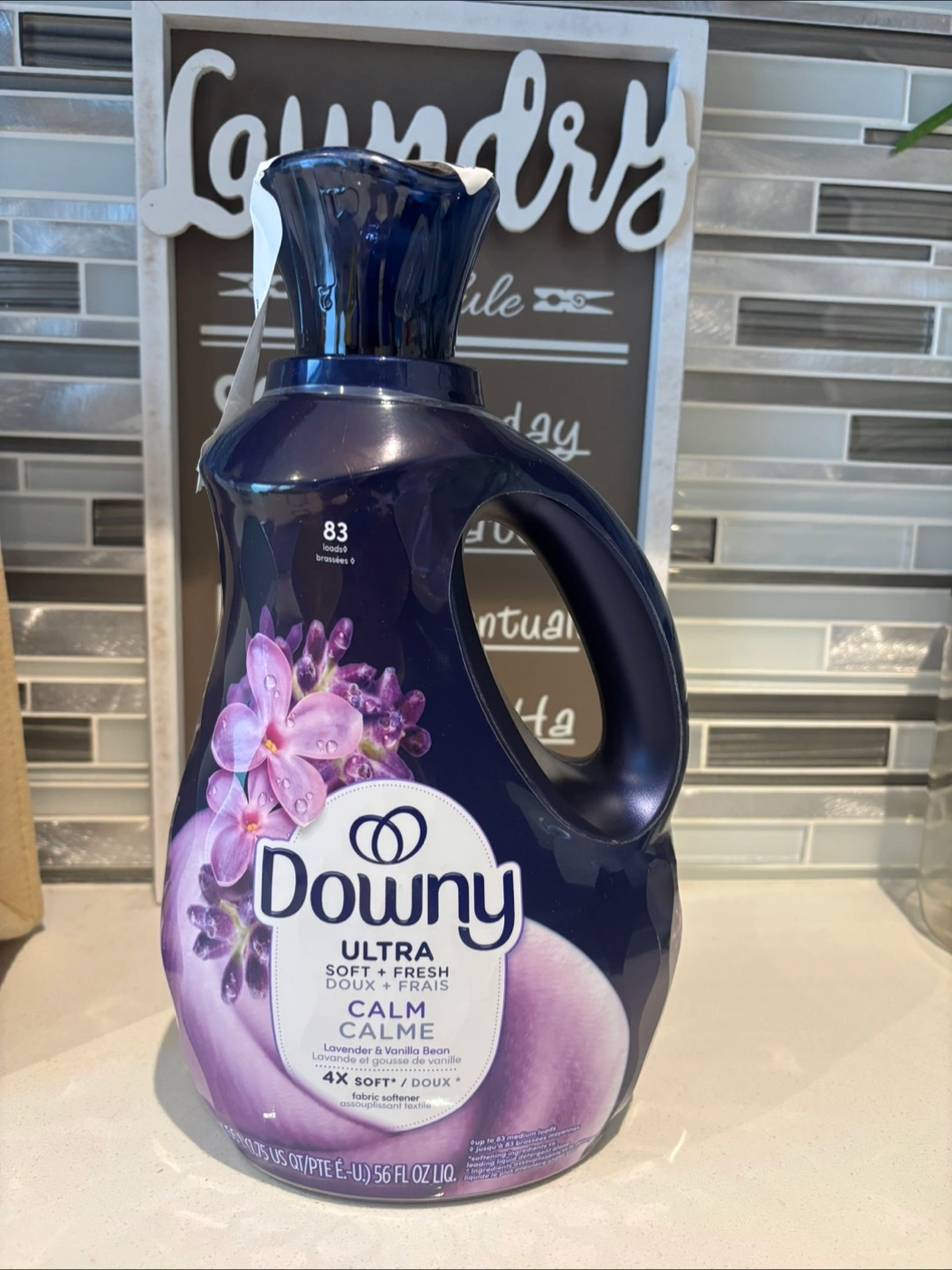 Selling a bottle of Downy Ultra Soft + Fresh Calm fabric softener in the Lavender & Vanilla Bean scent. It's a 56 fl oz bottle, offering 4X softness. Perfect for keeping your laundry feeling soft and smelling great