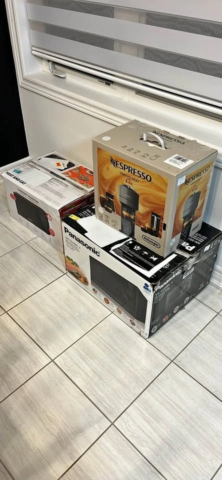 Selling as a Nespresso machine is barely used (very tiny scuff near the logo); the microwave is slightly used with broken legs, but it doesn't affect its operation/stability.