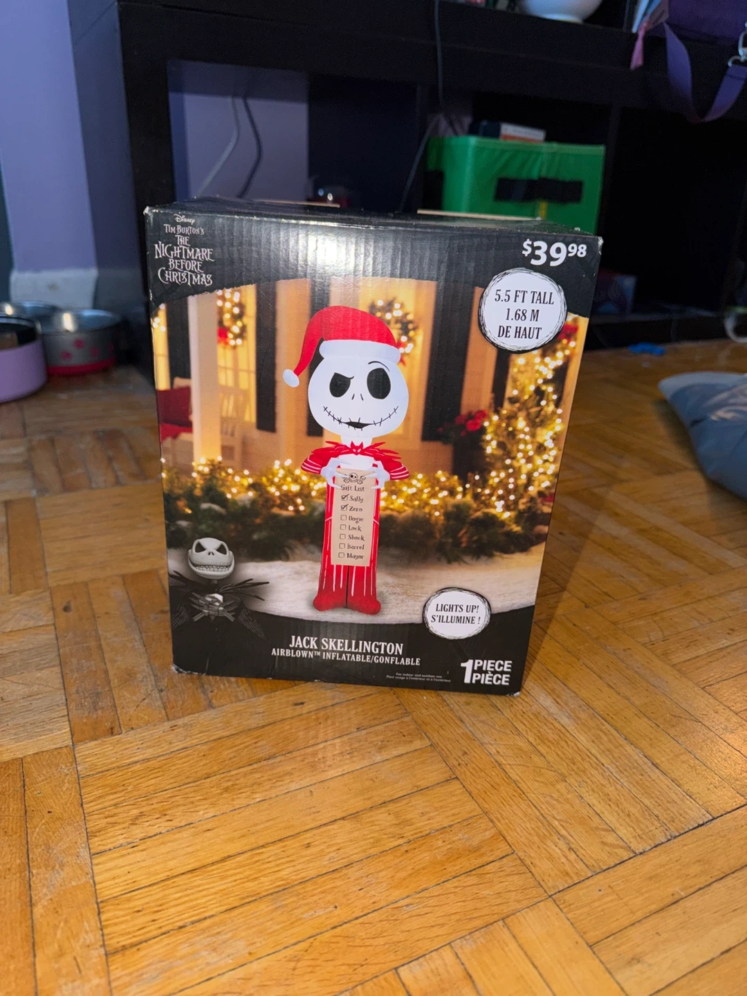 I'm selling a brand new, in-box Jack Skellington Airblown Inflatable! It stands 5.5 ft tall (1.68 m). The box says it lights up! Originally bought for $39.98.