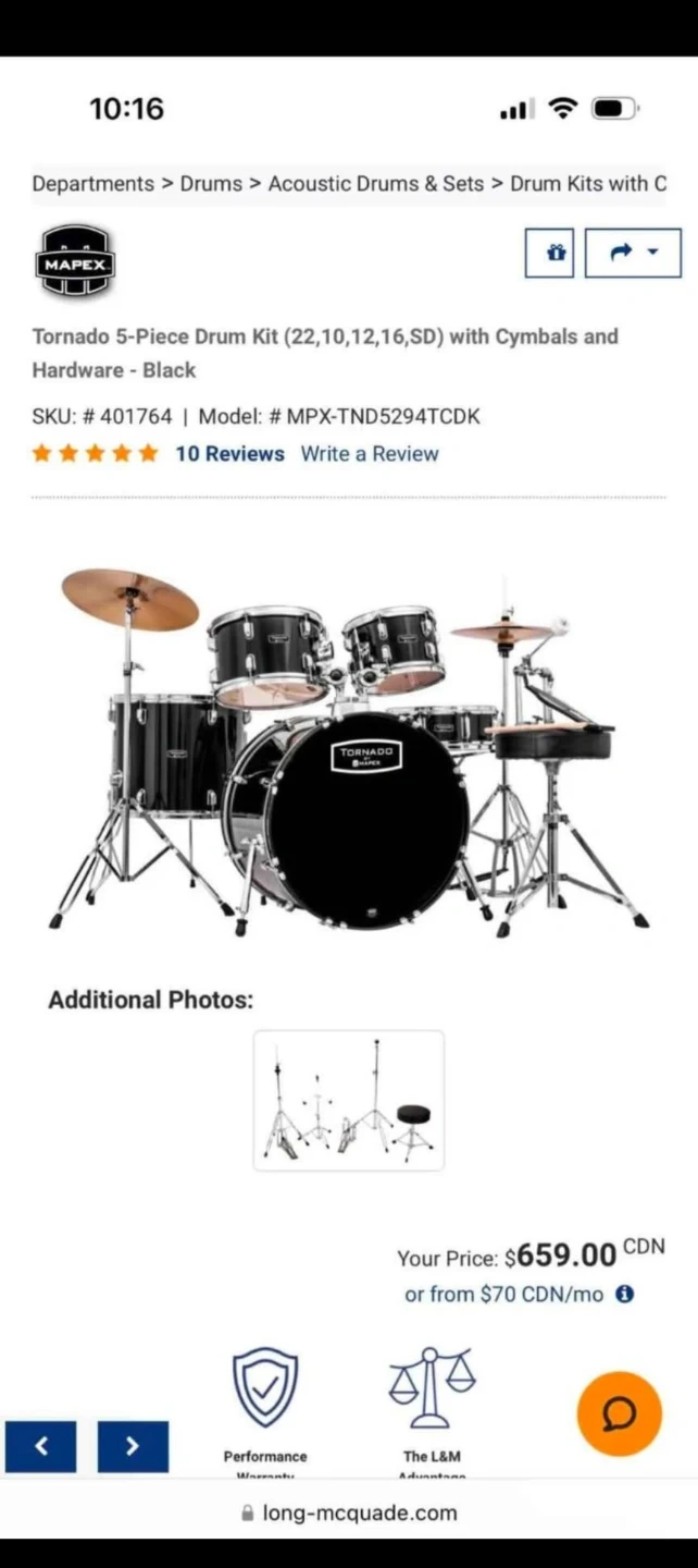 Selling a Mapex Tornado 5-piece drum kit in black! This kit includes cymbals and hardware. The model number is MPX-TND5294TCDK. Retails for $659.00 CDN.