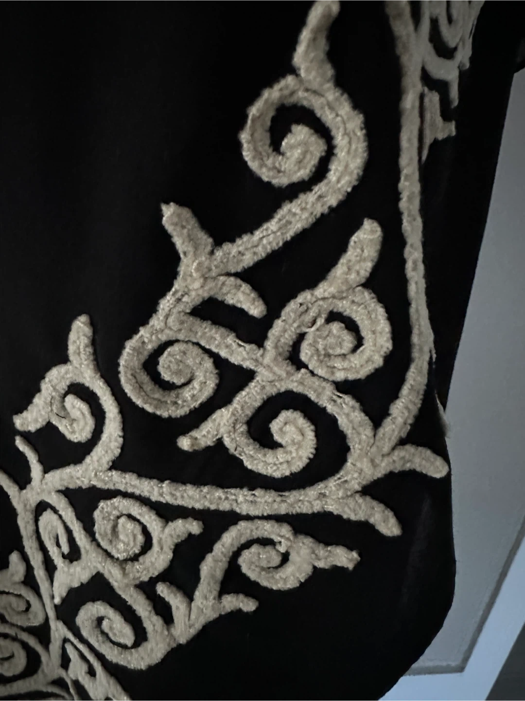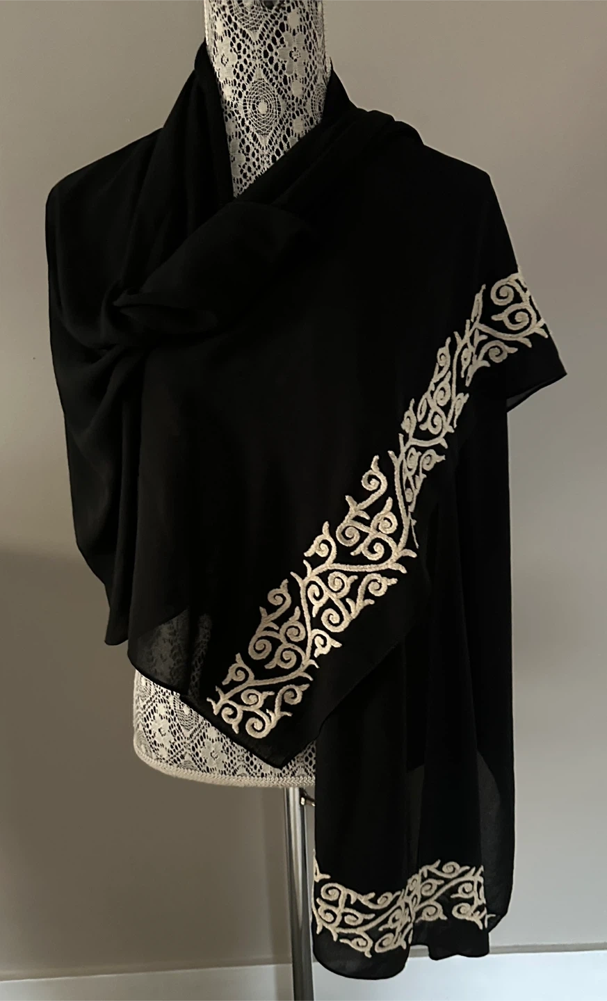 Beautiful black scarf featuring delicate embroidered detailing! It's a lovely accessory to add a touch of elegance to any outfit. The material feels soft and lightweight, making it comfortable to wear in any season
