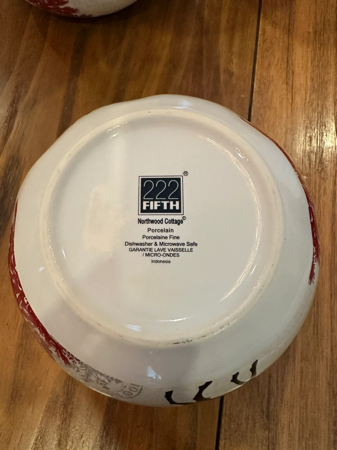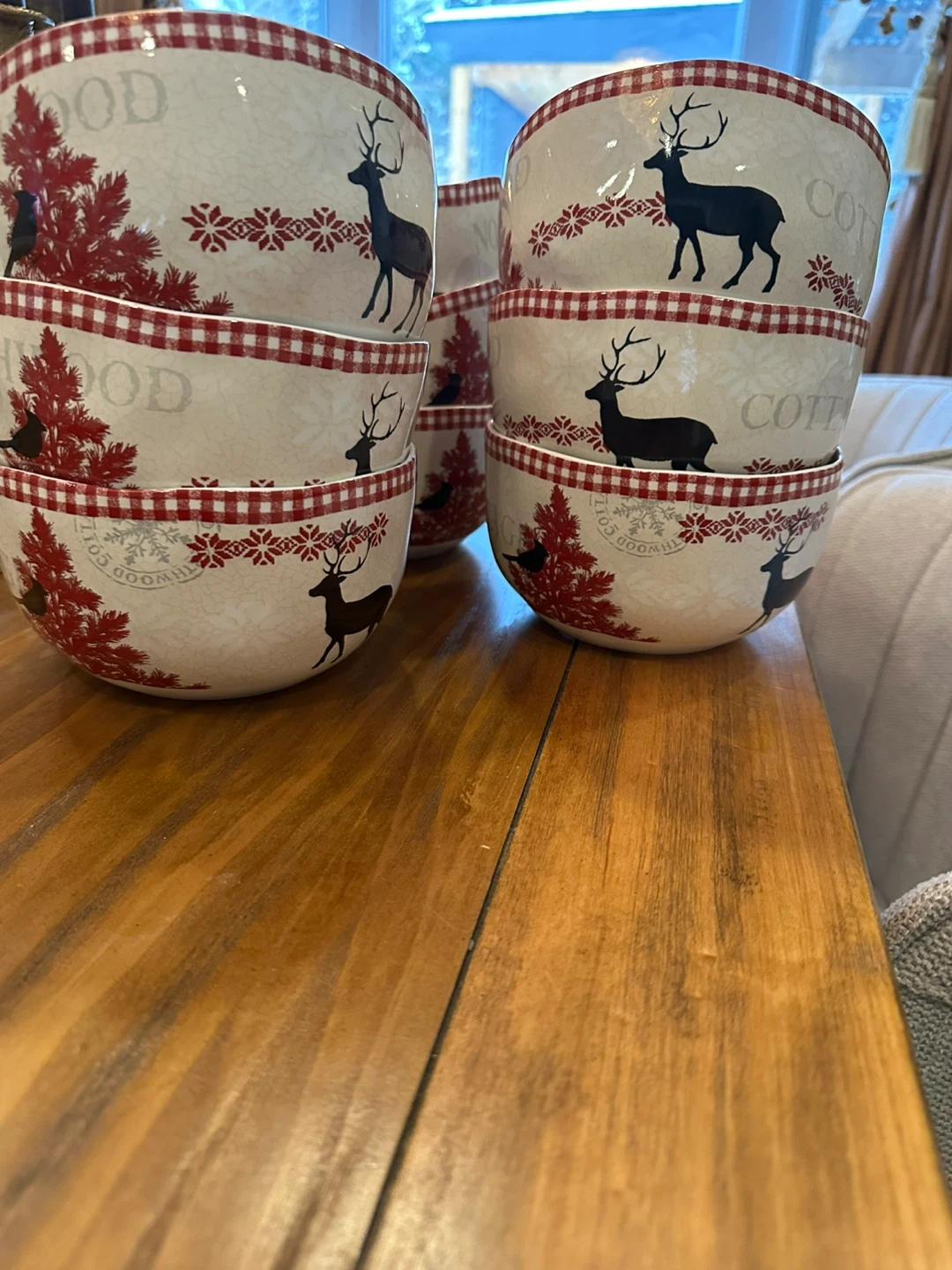 Set of 222 Fifth Northwood Cottage bowls. These porcelain bowls are dishwasher and microwave safe, featuring a charming deer and tree design. They are in great condition and ready for a new home!