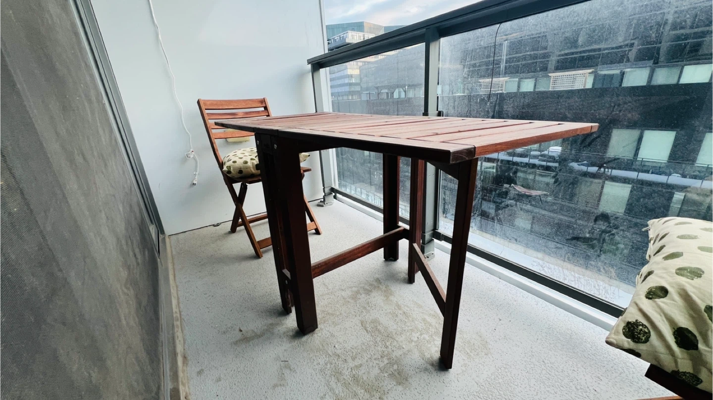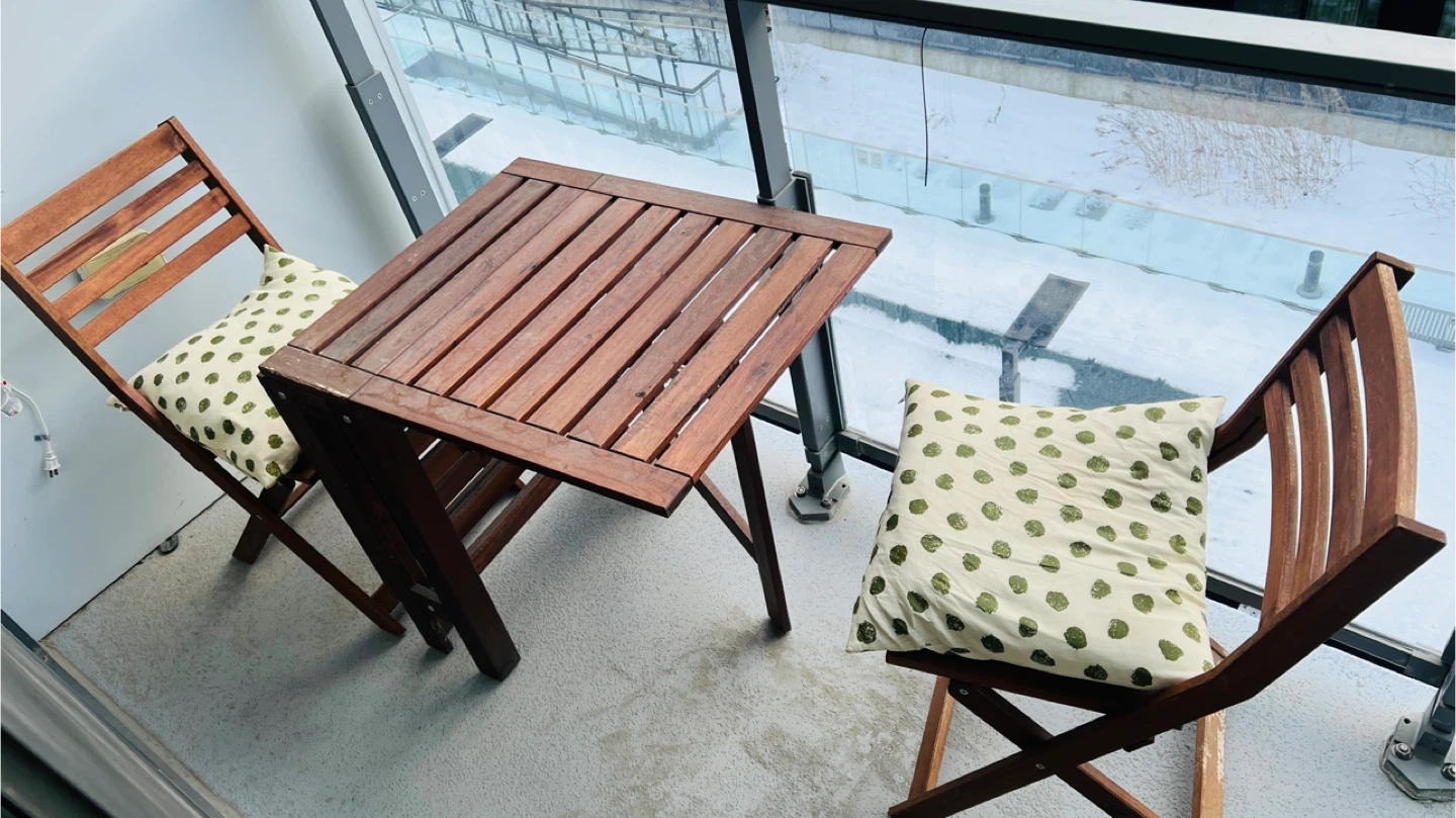 Selling a foldable wooden table and chair set, perfect for a balcony or small space. The set includes a table with a drop-leaf extension and two matching chairs with cushions. Great for enjoying a meal or relaxing outdoors!