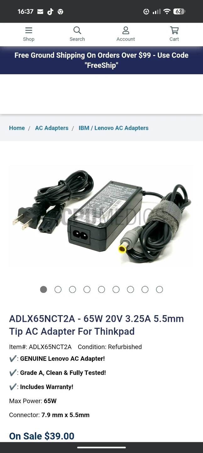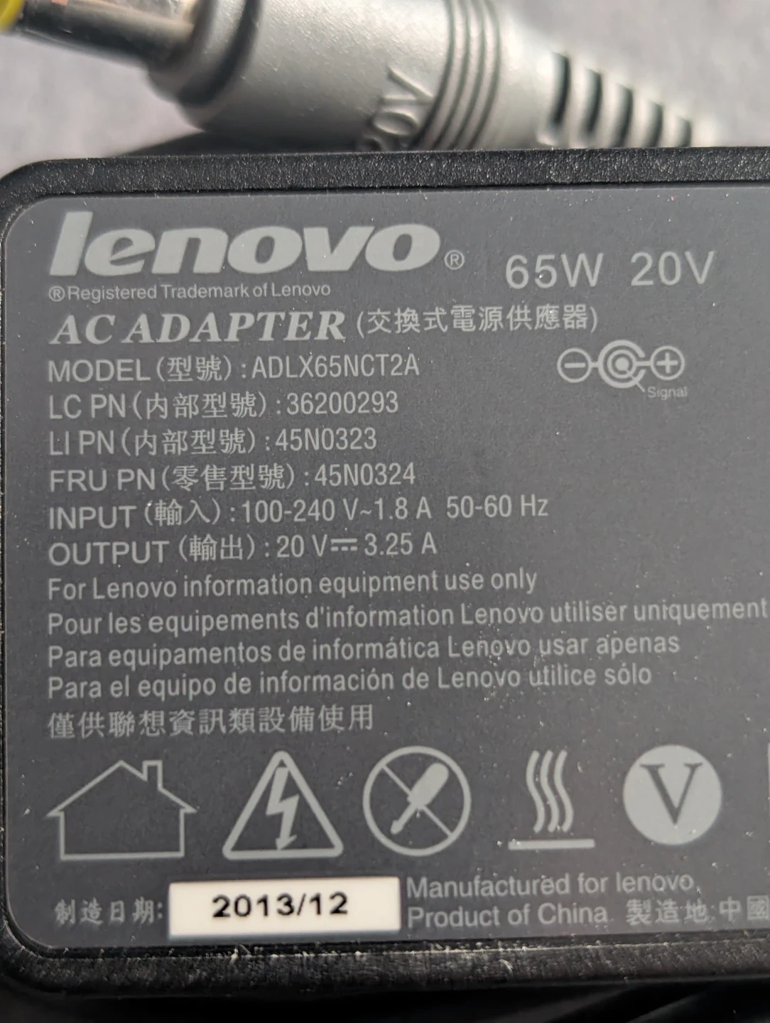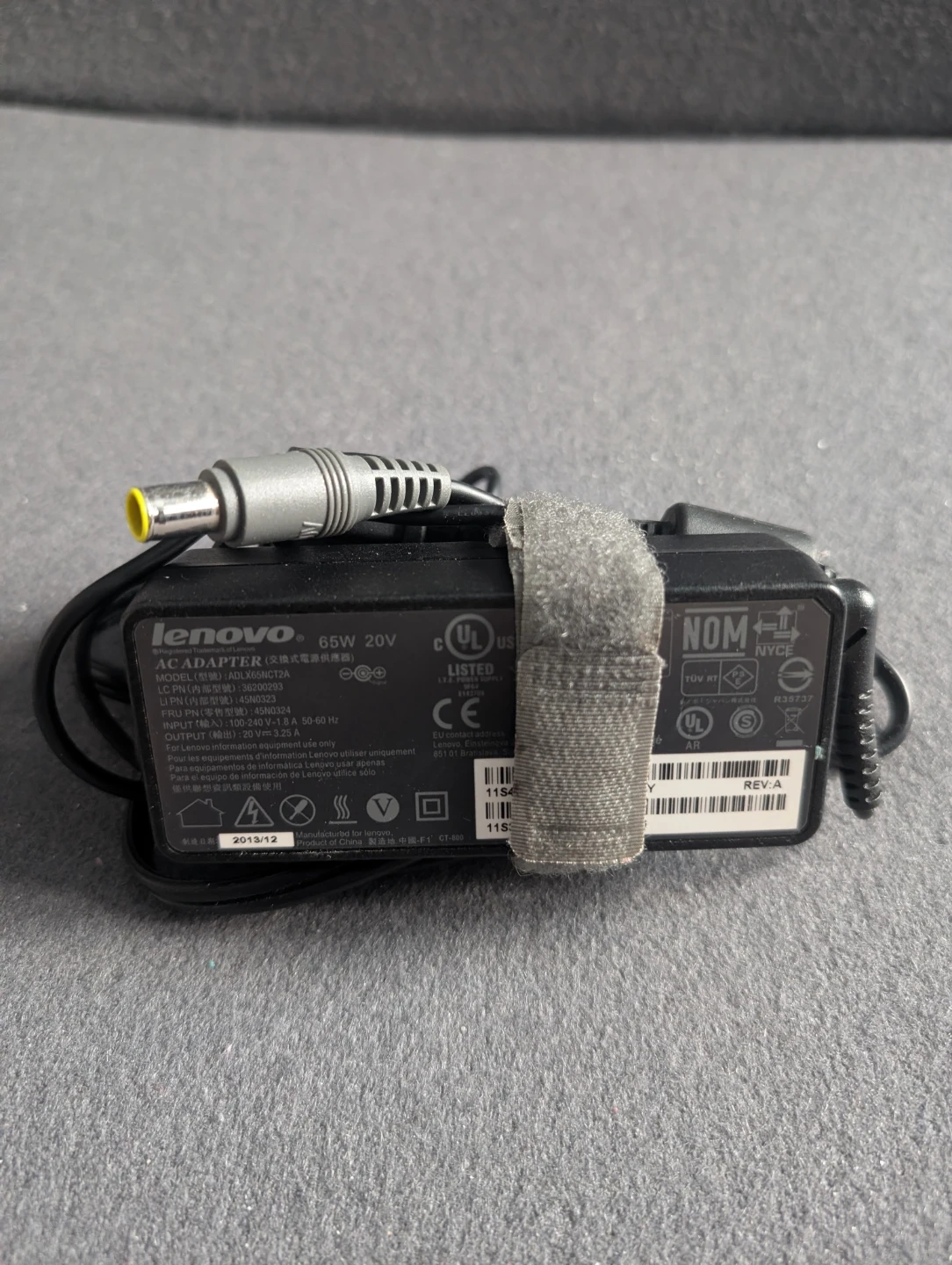 Selling a Lenovo 65W AC Adapter, model ADLX65NCT2A. This power adapter is compatible with older Lenovo ThinkPad models that require a round tip connector.