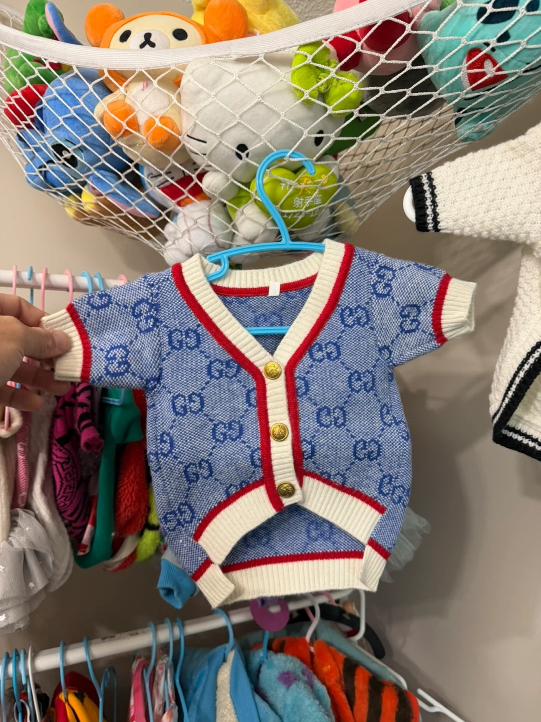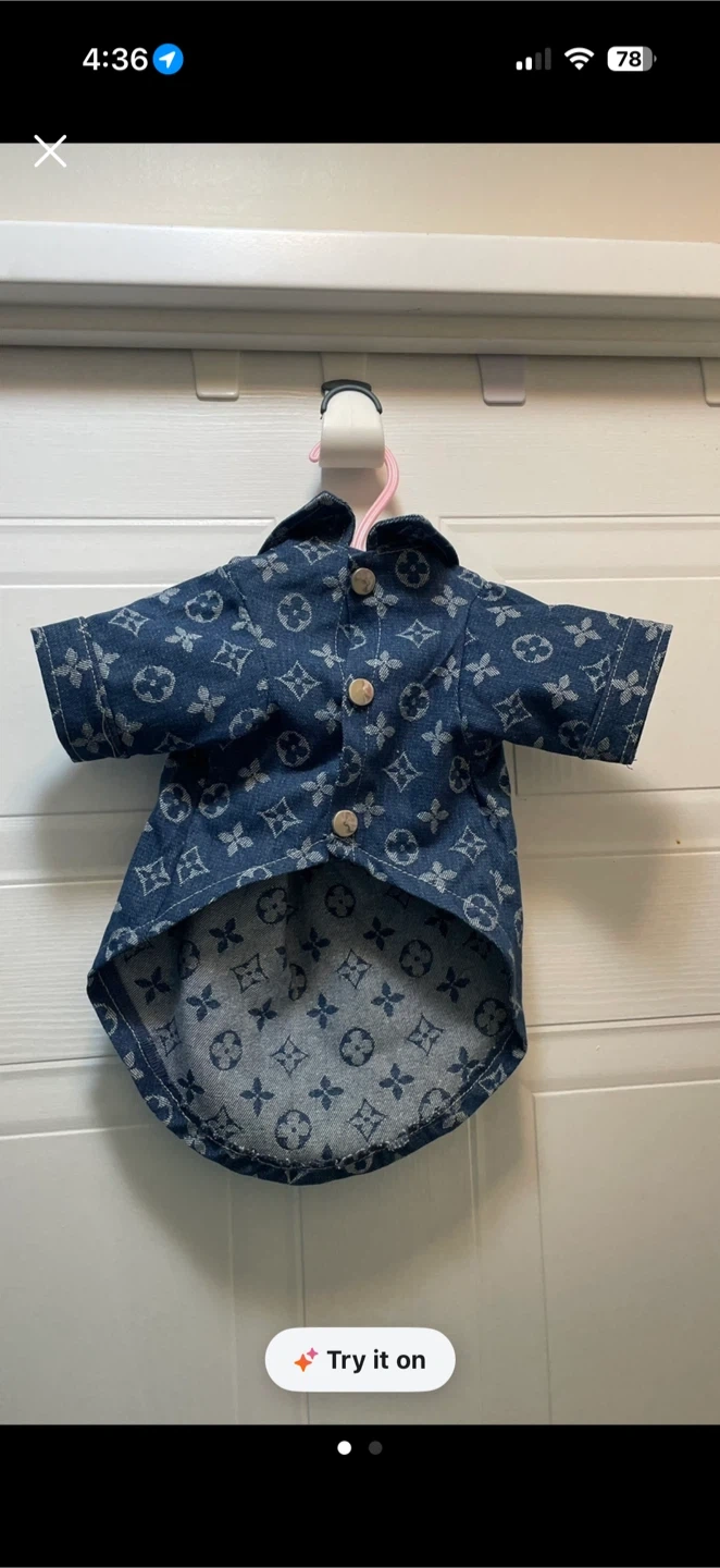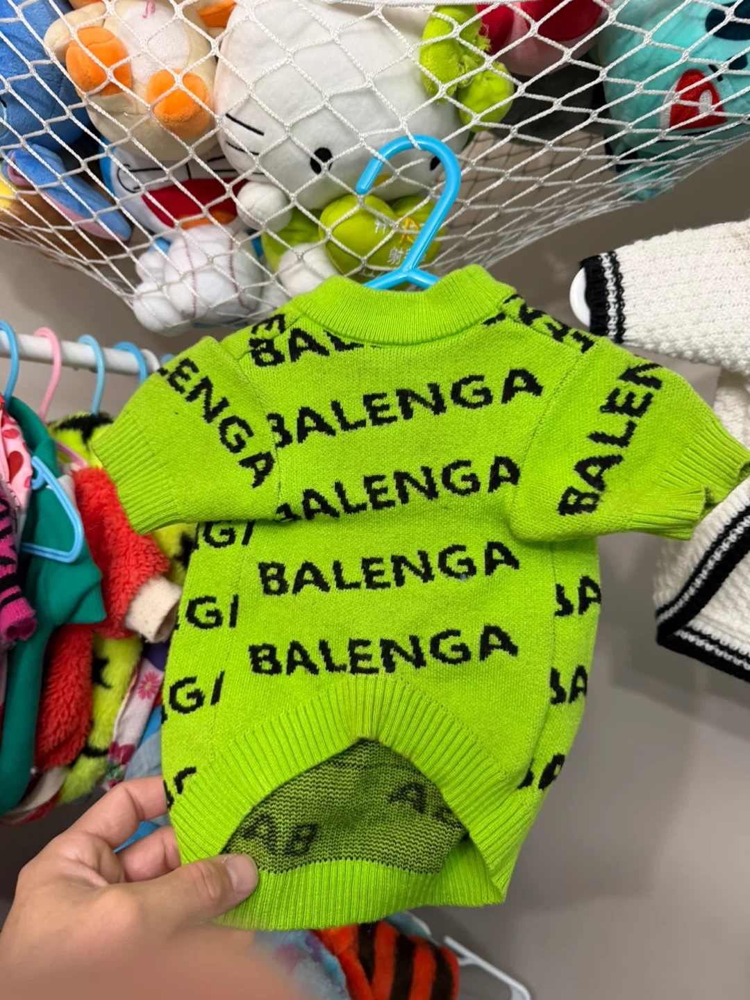 Selling a collection of designer dog clothes. Includes brands like Balenciaga (green), Louis Vuitton (blue), Gucci (blue), and Chanel (white). They're all in great condition and ready for your fashionable furry friend