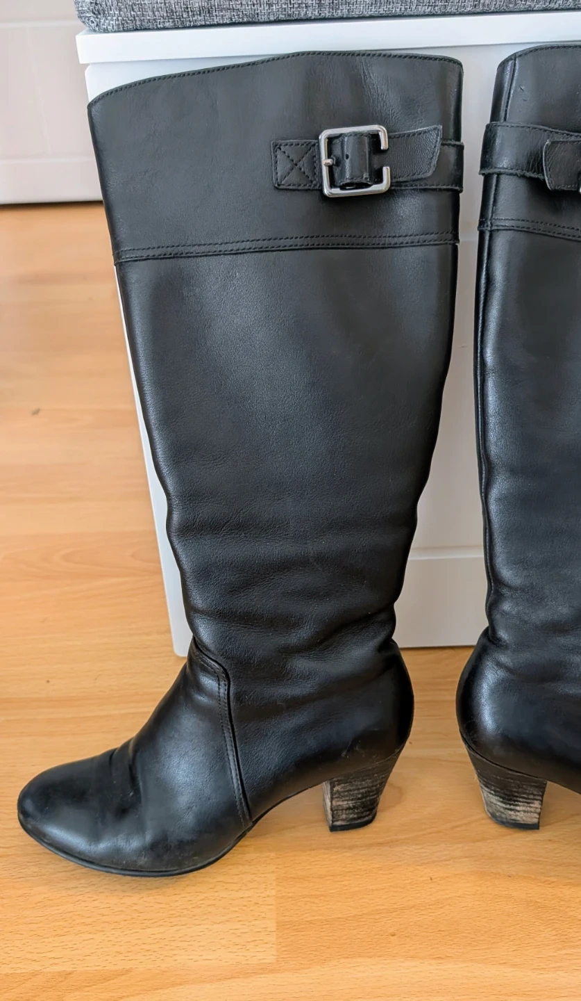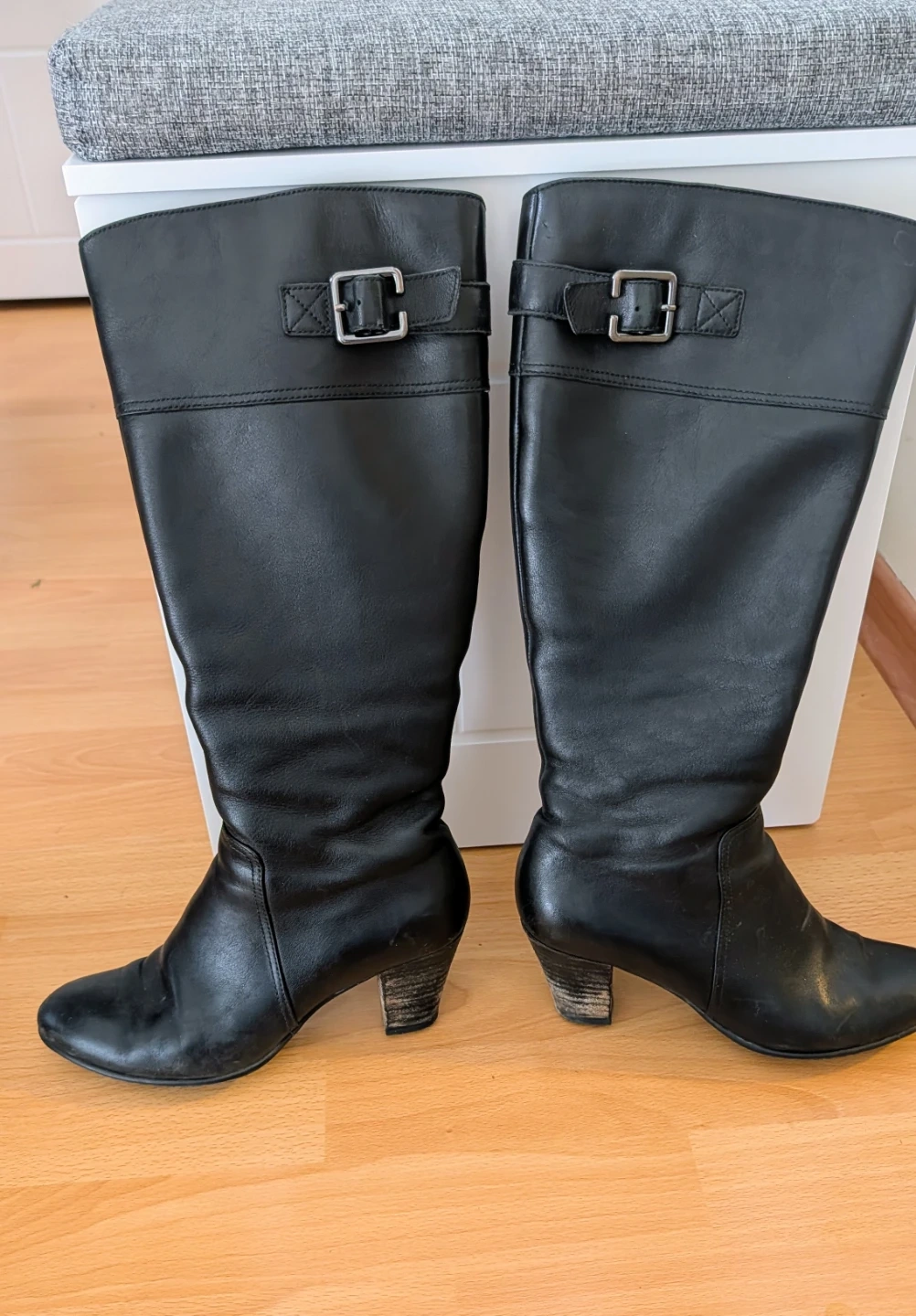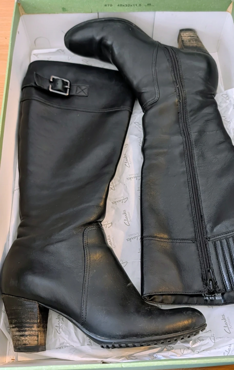 Selling a pair of Clarks knee-high boots in black leather. They are a size 6.5M. The boots feature a zipper closure and a decorative buckle at the top. The upper is made of leather, and the sole is man-made. They are in excellent condition.