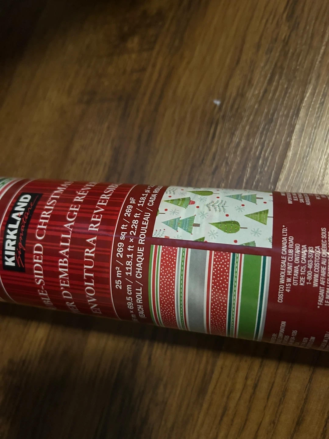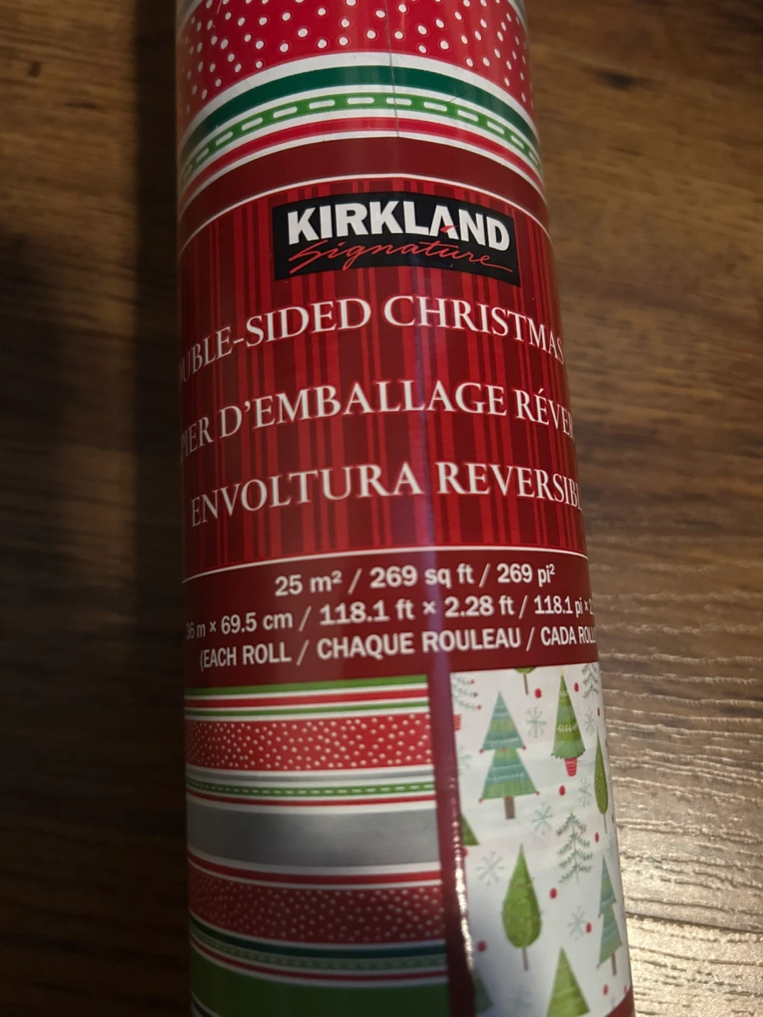 Selling a roll of Kirkland Signature double-sided Christmas wrapping paper. Each roll is 25 m² / 269 sq ft / 269 pi². The dimensions are 36 m x 69.5 cm / 118.1 ft x 2.28 ft / 118.1 pi² per roll