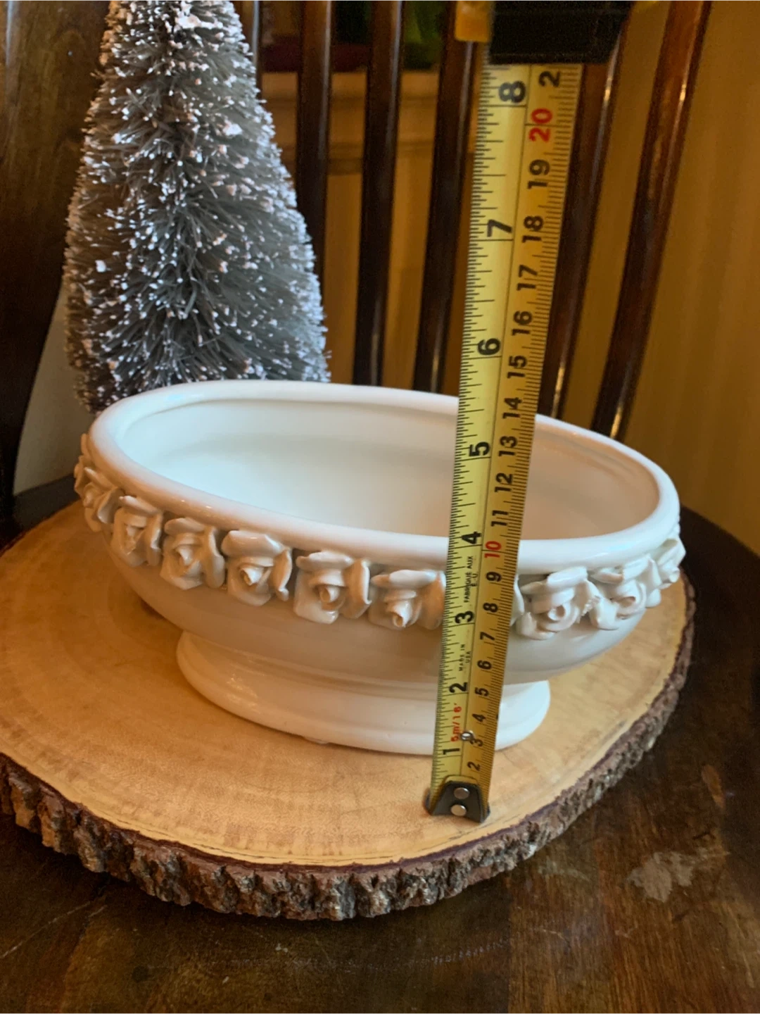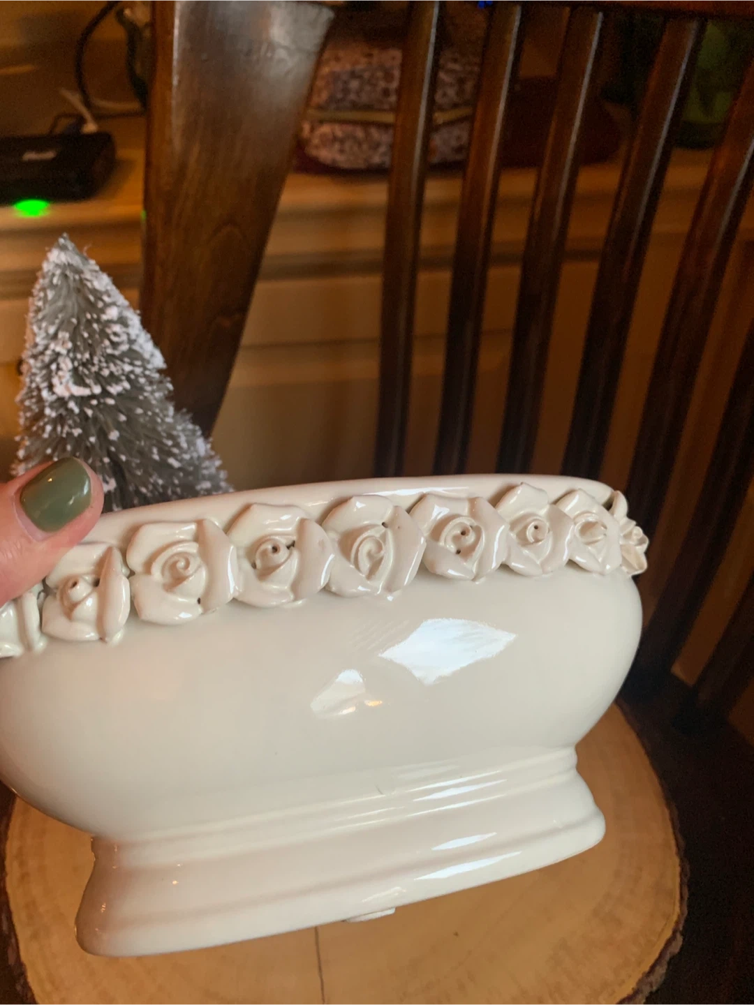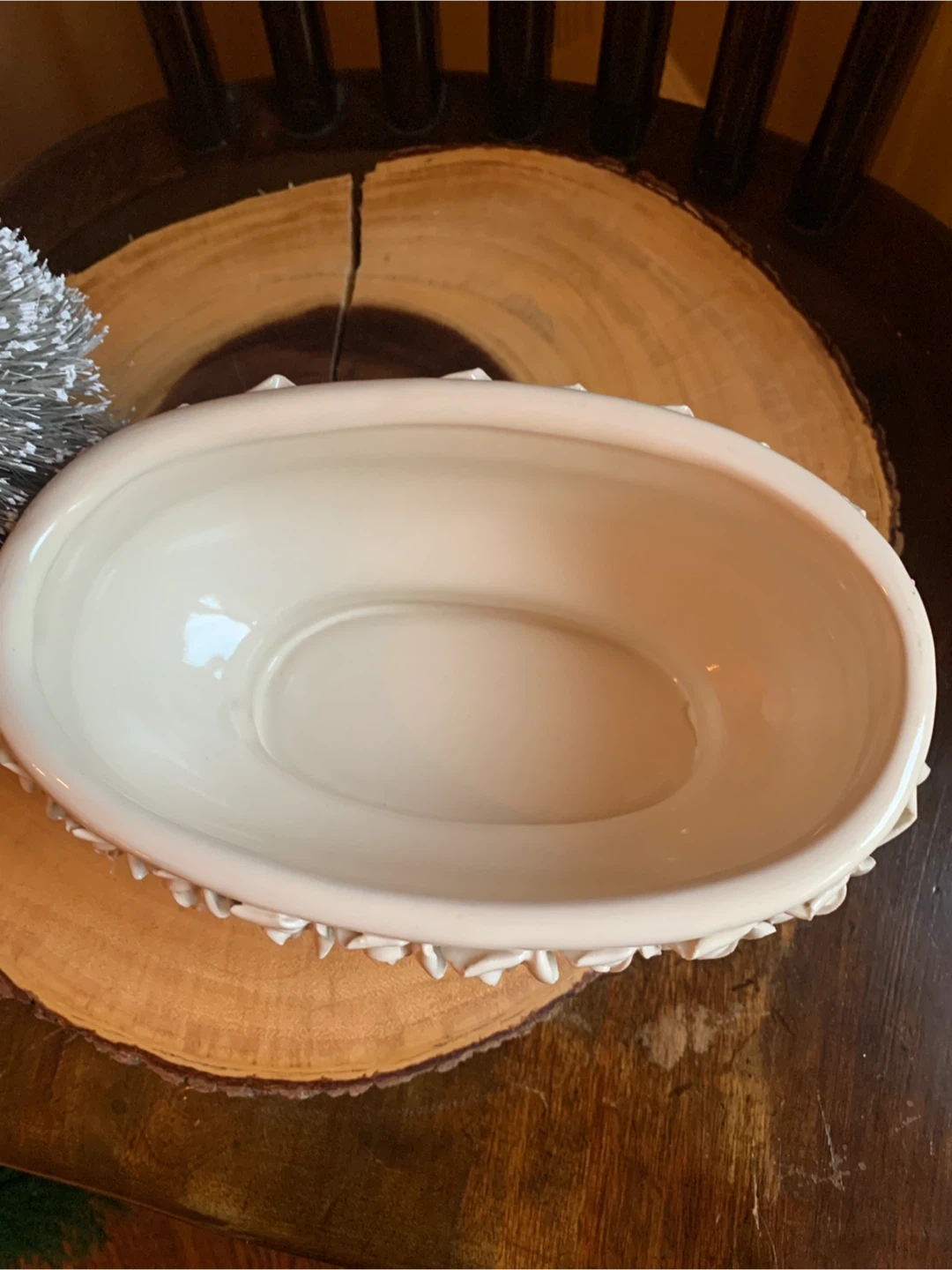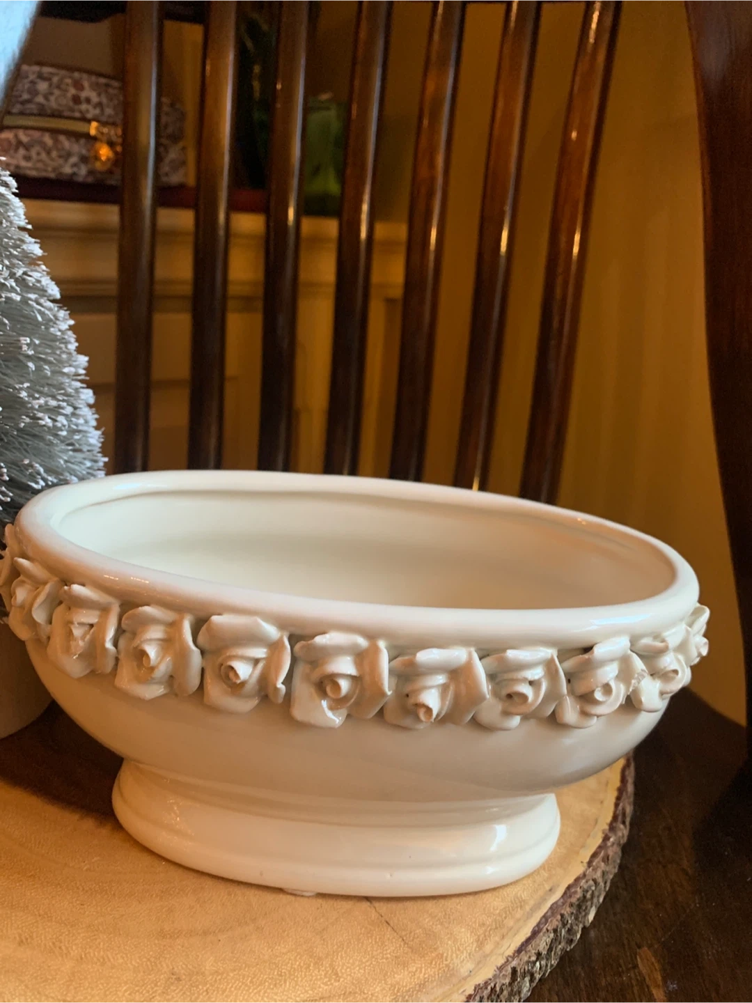 Here's a lovely creamy white ceramic planter! It features a beautiful floral design of rosebuds around the rim. It is 7.5” long and 4.5” wide. It comes with little protective pads on the bottom for scratch free placing. Perfect for adding a touch of elegance to your home or garden. Would look lovely with a set of succulents or a little bonsai! A real sweet planter.