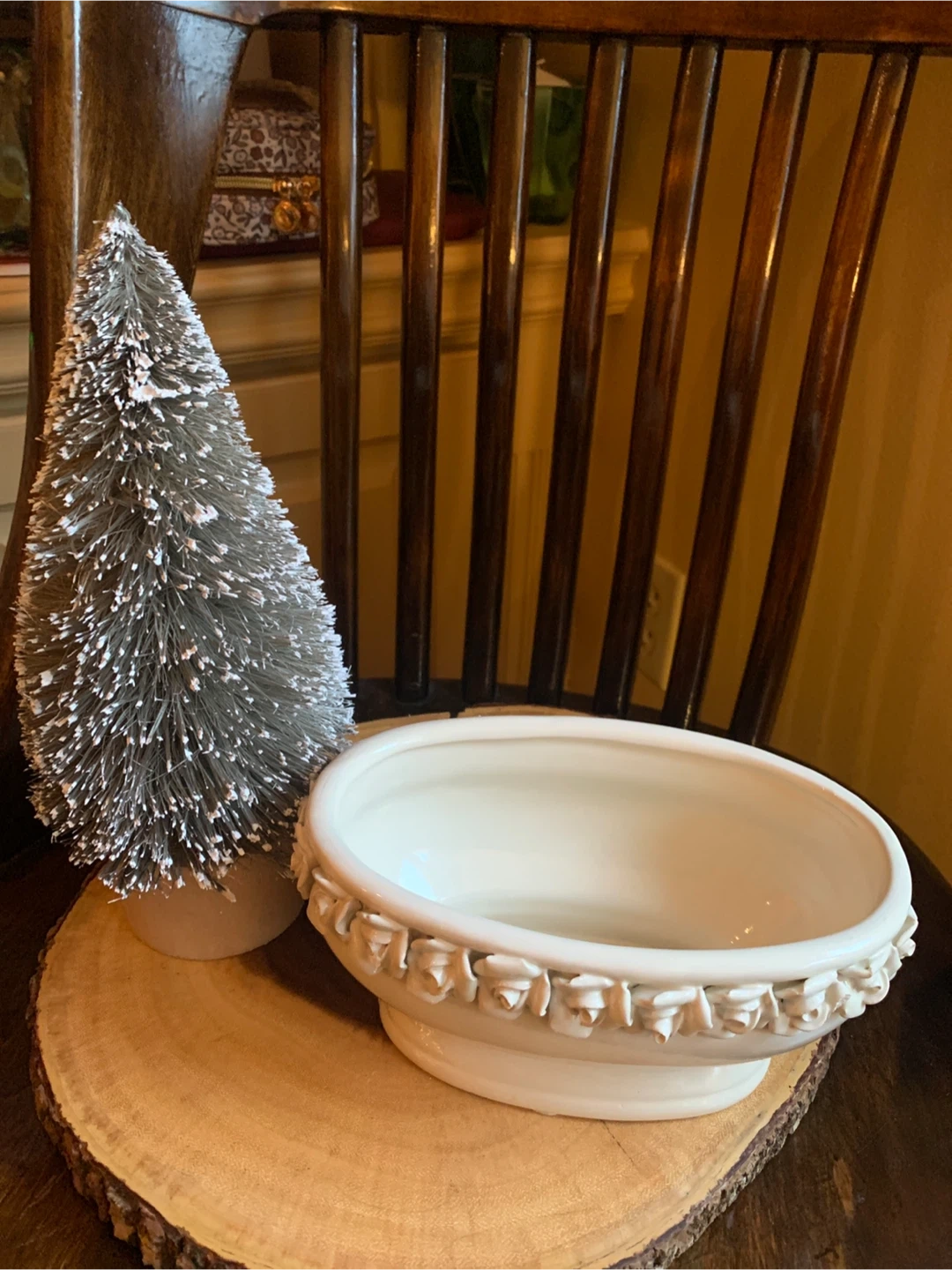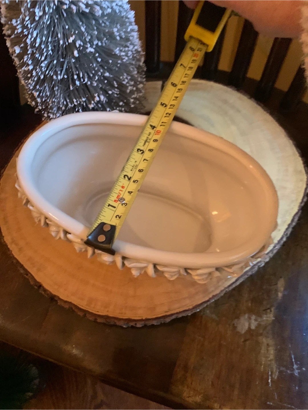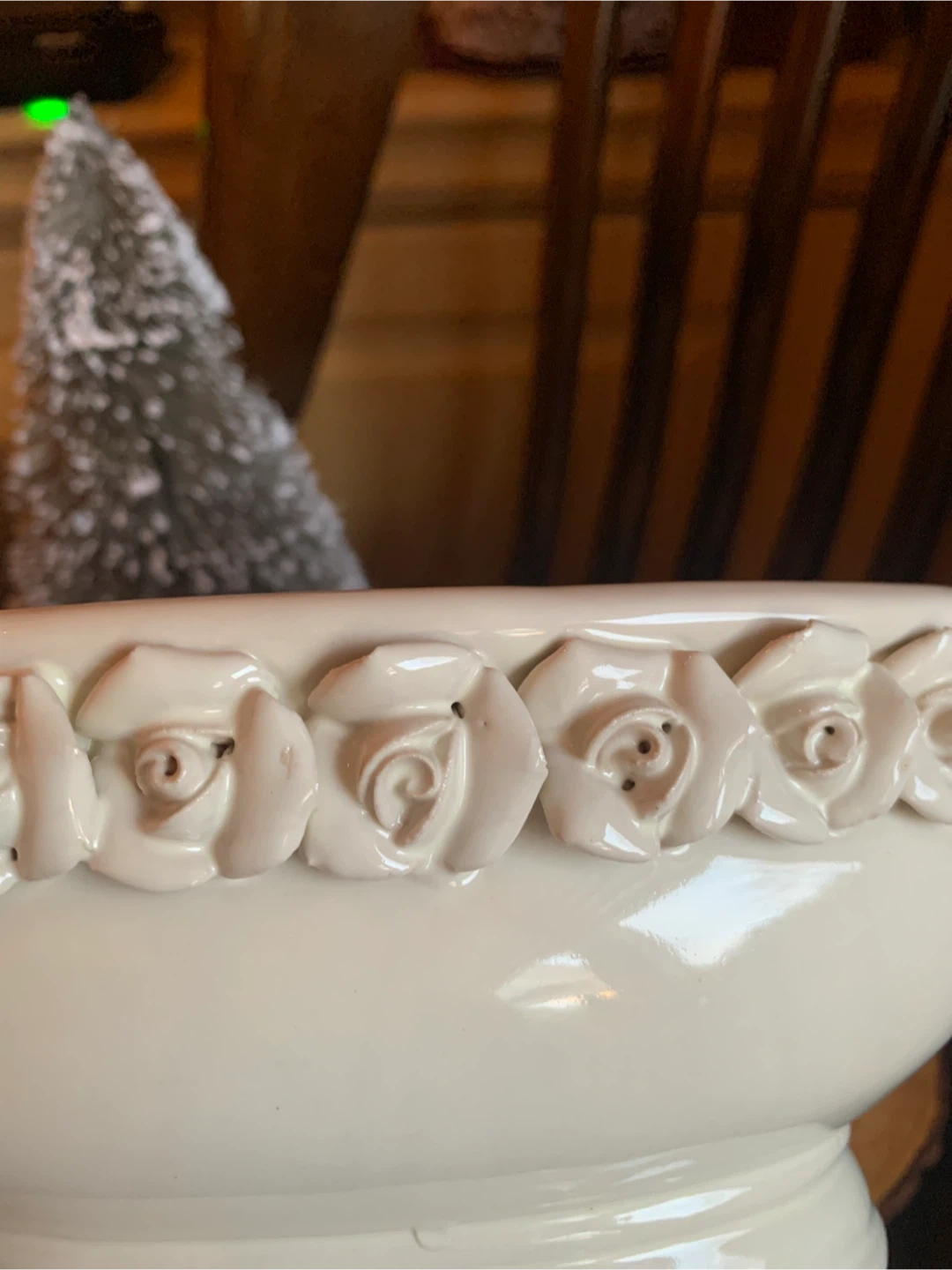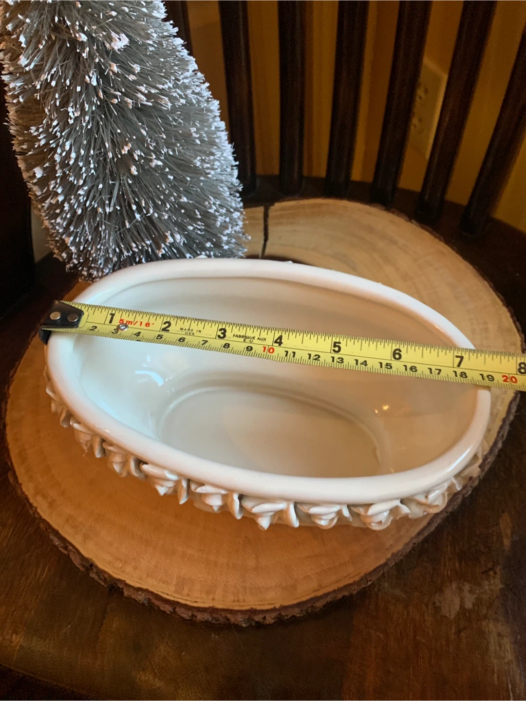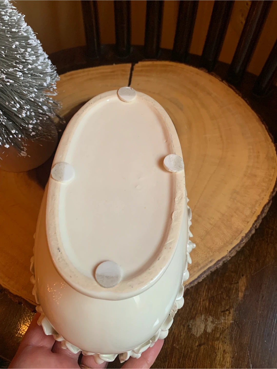 Here's a lovely creamy white ceramic planter! It features a beautiful floral design of rosebuds around the rim. It is 7.5” long and 4.5” wide. It comes with little protective pads on the bottom for scratch free placing. Perfect for adding a touch of elegance to your home or garden. Would look lovely with a set of succulents or a little bonsai! A real sweet planter.