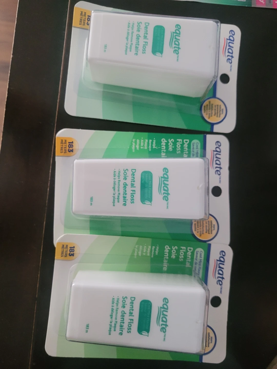 I have some Equate dental floss for sale! There are two sizes available: 103 meters and 183 meters. All are in new condition, still sealed in their original packaging! Great for keeping your teeth clean and healthy $5 each, 2 x $8 or 3 for $10