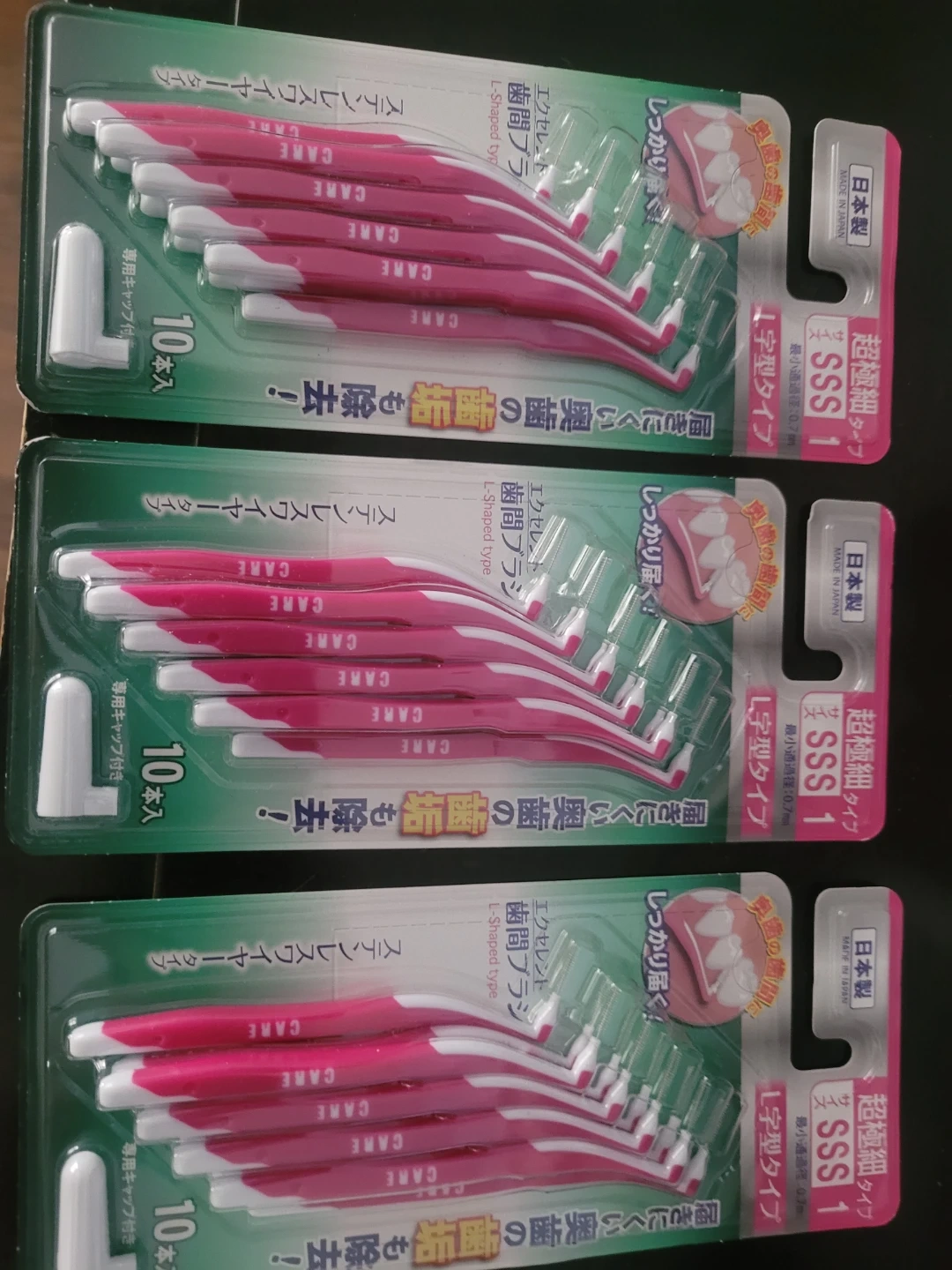 I have some CARE interdental brushes for sale. They are the SSS 1 size, which is an extra fine type with a minimum passage diameter of 0.7mm. These L-shaped brushes are designed to reach the plaque in hard-to-reach molars. Each brush has a stainless steel wire and comes with a cap. There are 10 brushes per pack $5 each or 2 x $8 or 3 for $10