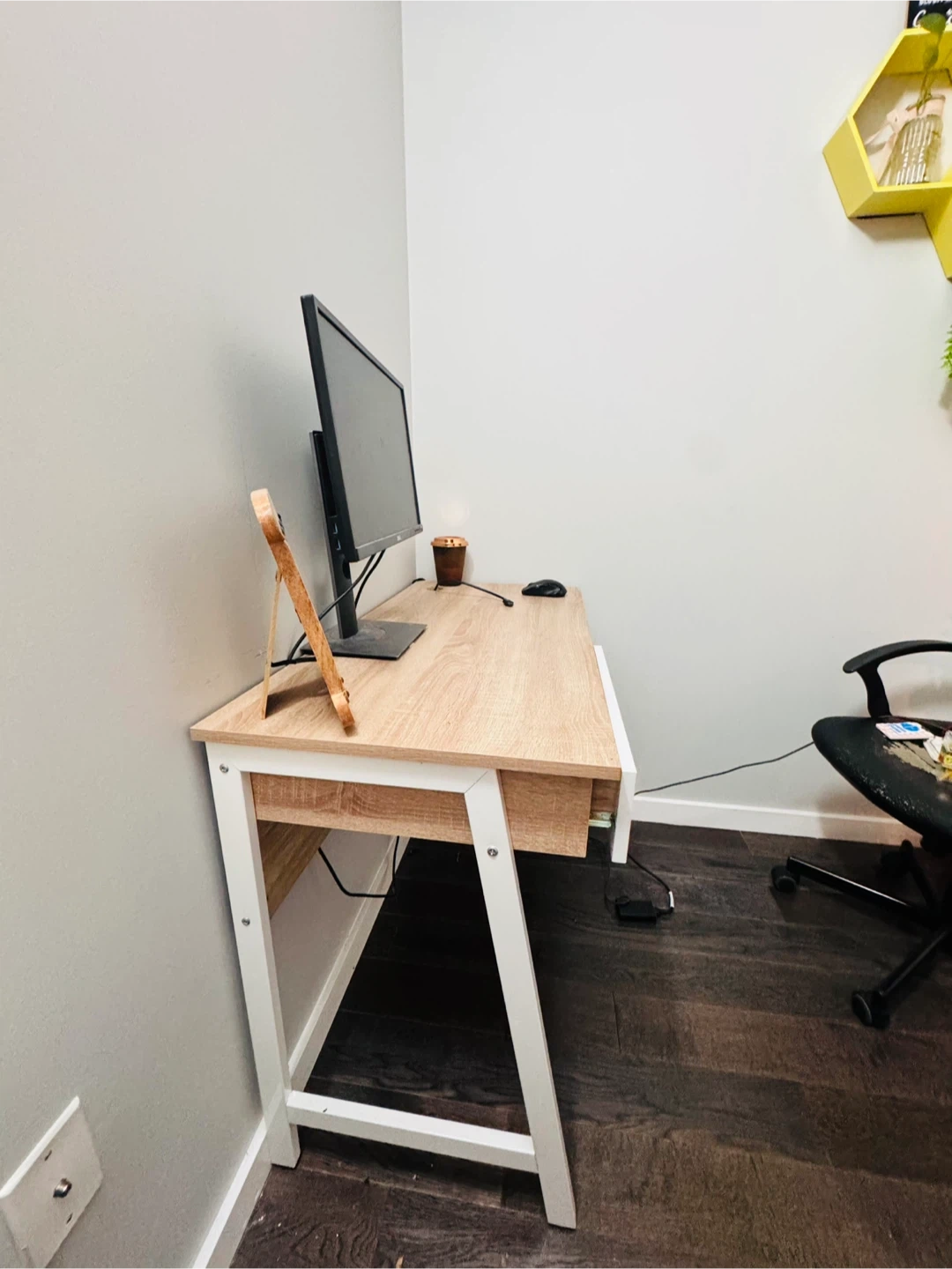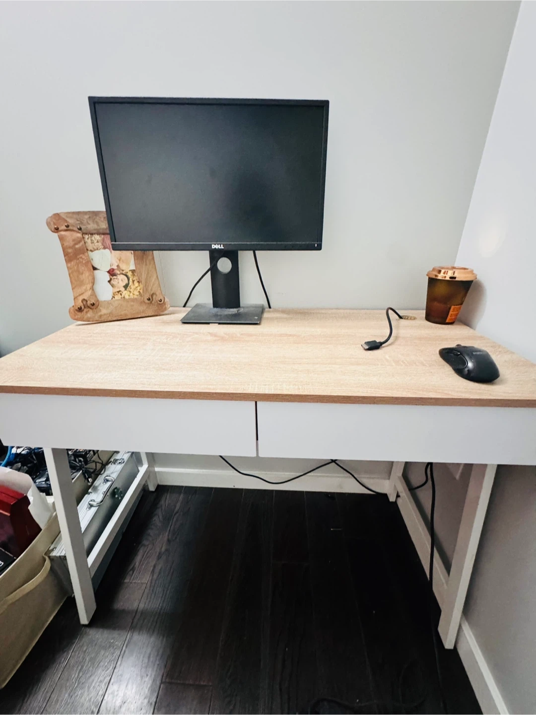 Selling a desk that's perfect for a home office or study space! It features a clean design with white legs and a light wood-tone top. The desk also has built-in drawers for convenient storage