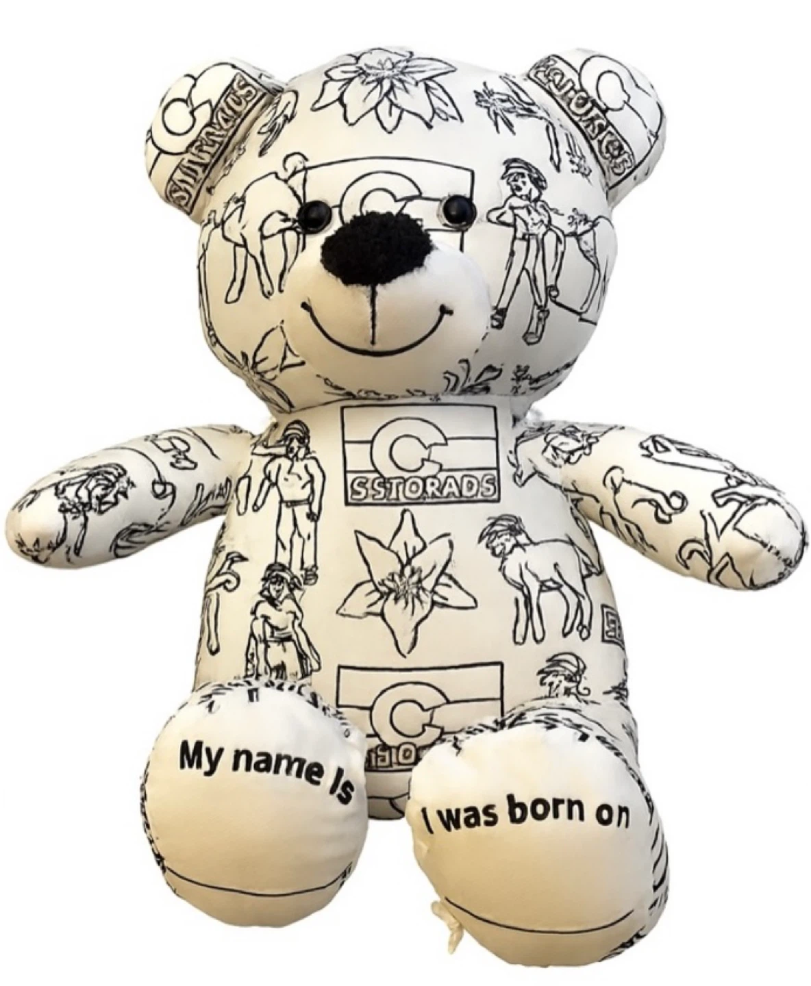 Color Me Plush Colorado bear by The RGU Group (2022). Features iconic Colorado illustrations — state flag, wildlife, flowers, and cultural motifs — printed across soft fabric. Designed to be coloured in, making it a fun keepsake, gift, or display piece.