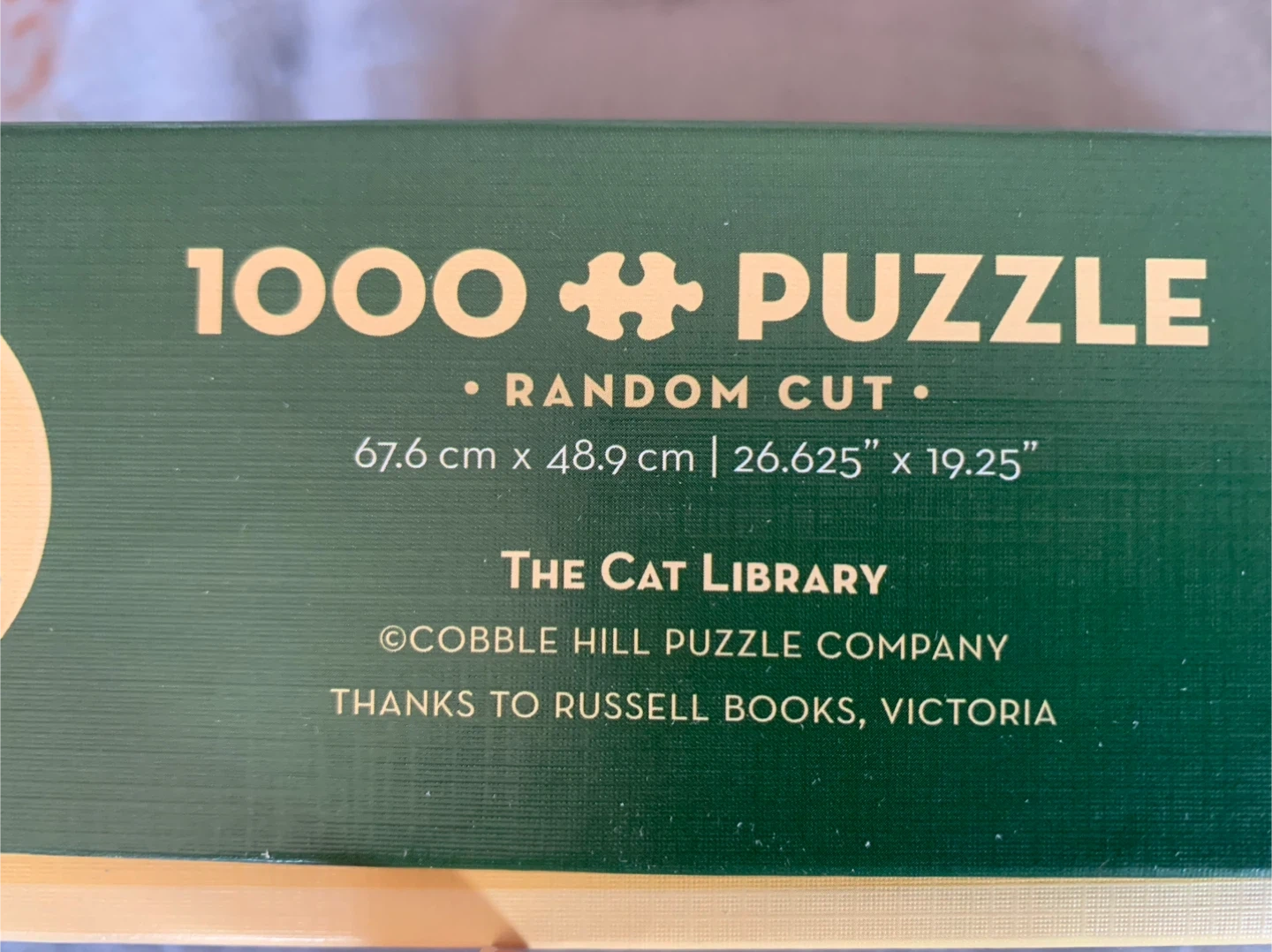 Selling a Cobble Hill 1000-piece puzzle called "The Cat Library"; based on a bookshelf from The Russell Books store in Victoria. It features a random cut and comes with a poster included. The assembled puzzle measures 67.6 cm x 48.9 cm (26.625" x 19.25").