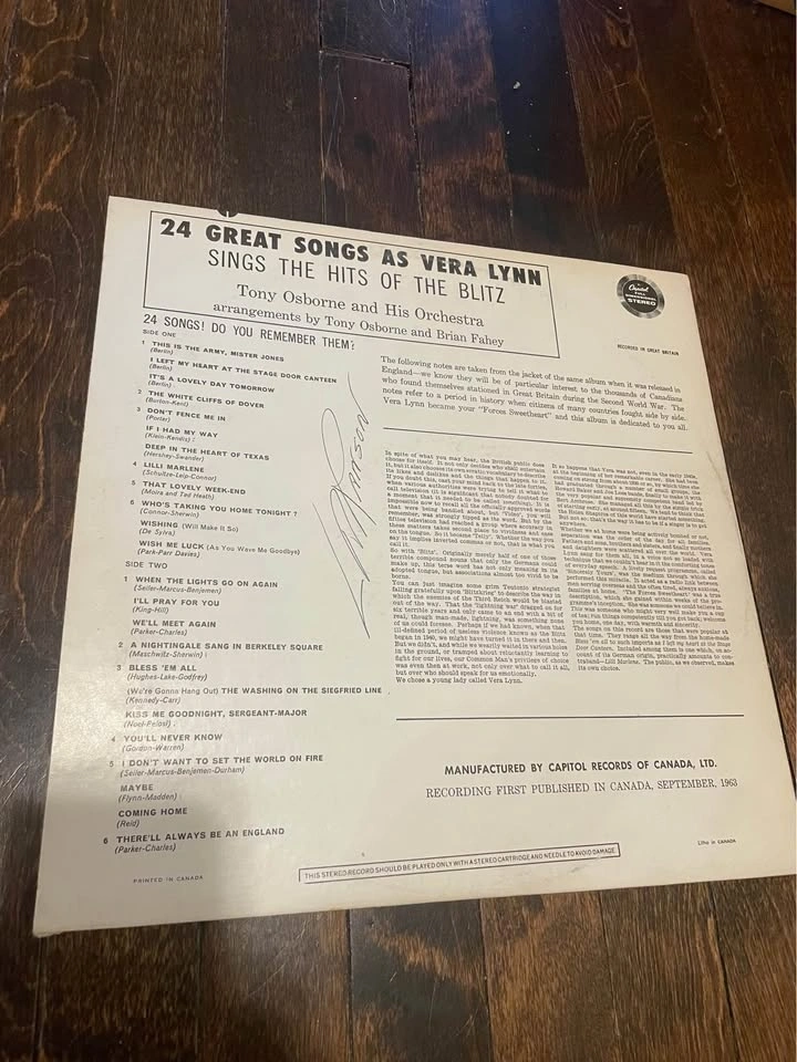 Vera Lynn – Hits of the Blitz (Capitol ST 6041, Stereo LP) Vintage 1963 Canadian pressing featuring 24 classic wartime-era performances by the legendary Vera Lynn, known as “The Forces’ Sweetheart.”