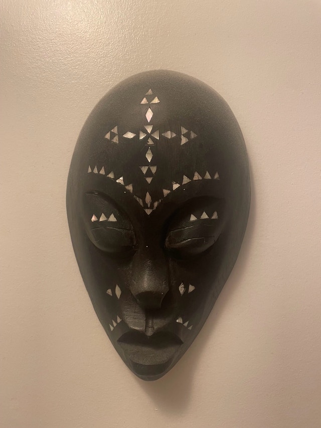 Beautiful handcrafted wooden mask from Lombok, Indonesia, featuring intricate mother-of-pearl inlays. A striking piece of cultural decor, perfect for adding a unique and artistic touch to any space. Great for collectors or as a statement wall decoration. Pickup available.