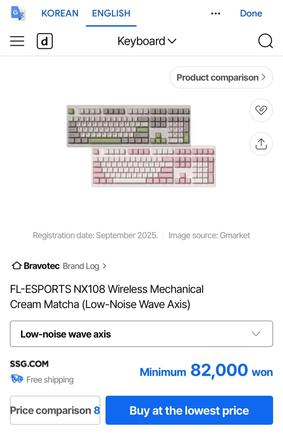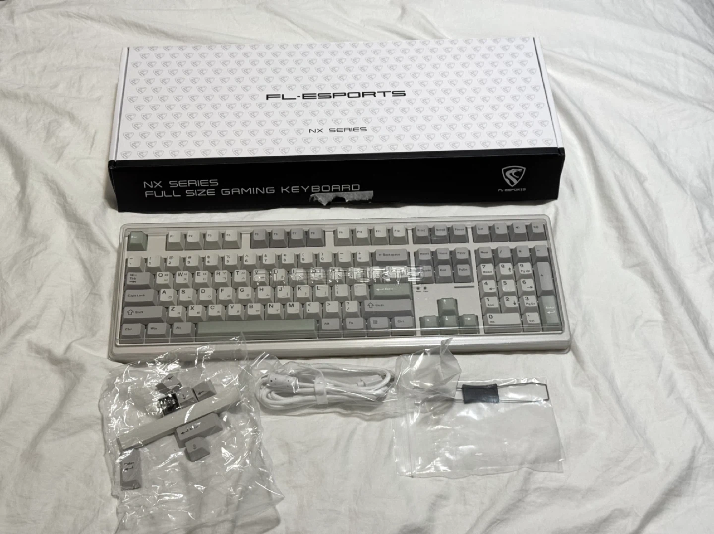 Selling a FL-ESPORTS NX108 wireless mechanical keyboard in a lovely cream matcha colour! And KTT silent phantom switches installed. Korean character printed on keycaps.
