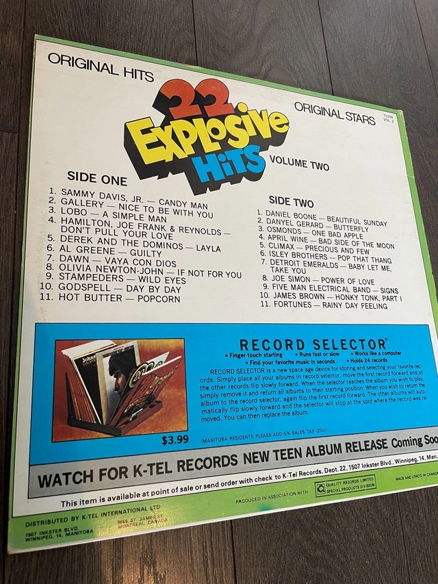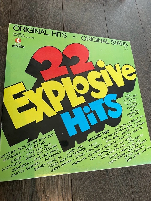 Relive the golden era with this K-Tel "22 Explosive Hits" Volume Two vinyl record! This vintage LP features a compilation of original hits and original stars. It's a fantastic addition to any record collection! The vinyl shows signs of wear. Perfect for parties and getting nostalgic! If this ad is still up, then it is still available! I operate on the principle that you should assume it is available unless I mark it as unavailable!