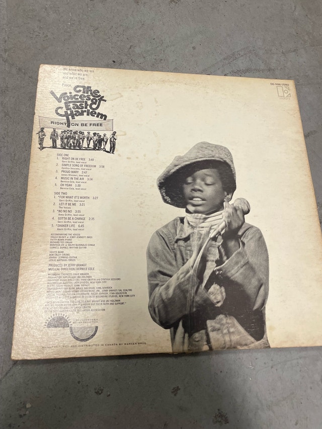 Selling a used record album by The Voices of East Harlem titled Right On Be Free. This album is in fair condition, showing its age, but still a great listen for any vinyl collector or fan of soul music. A groovy find for those who appreciate the classics! * **Artist:** The Voices of East Harlem * **Title:** Right On Be Free If the ad's up, it's available! Don't miss out on this gem!