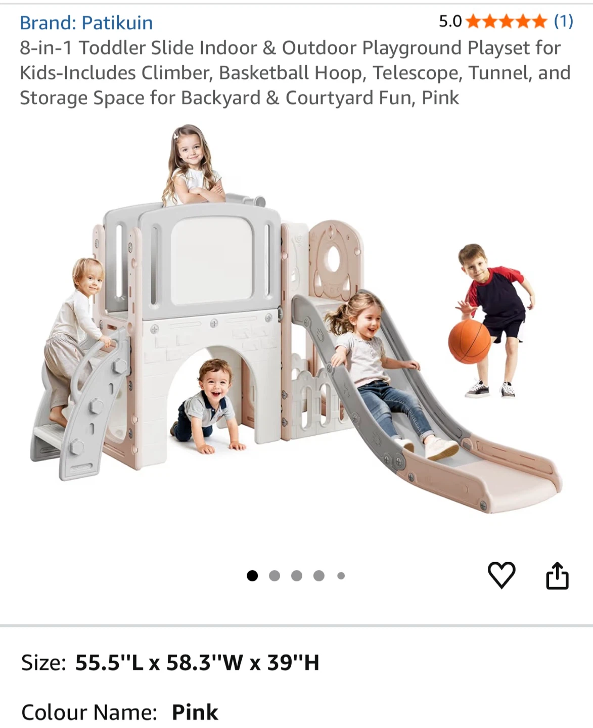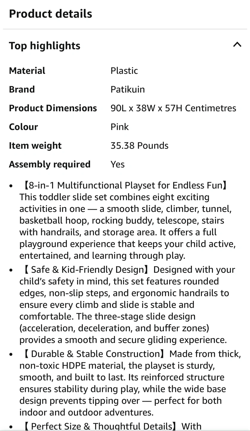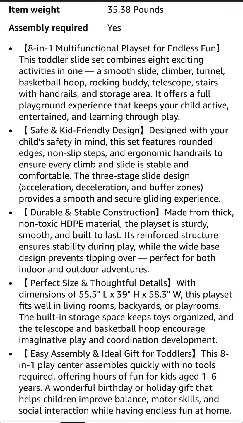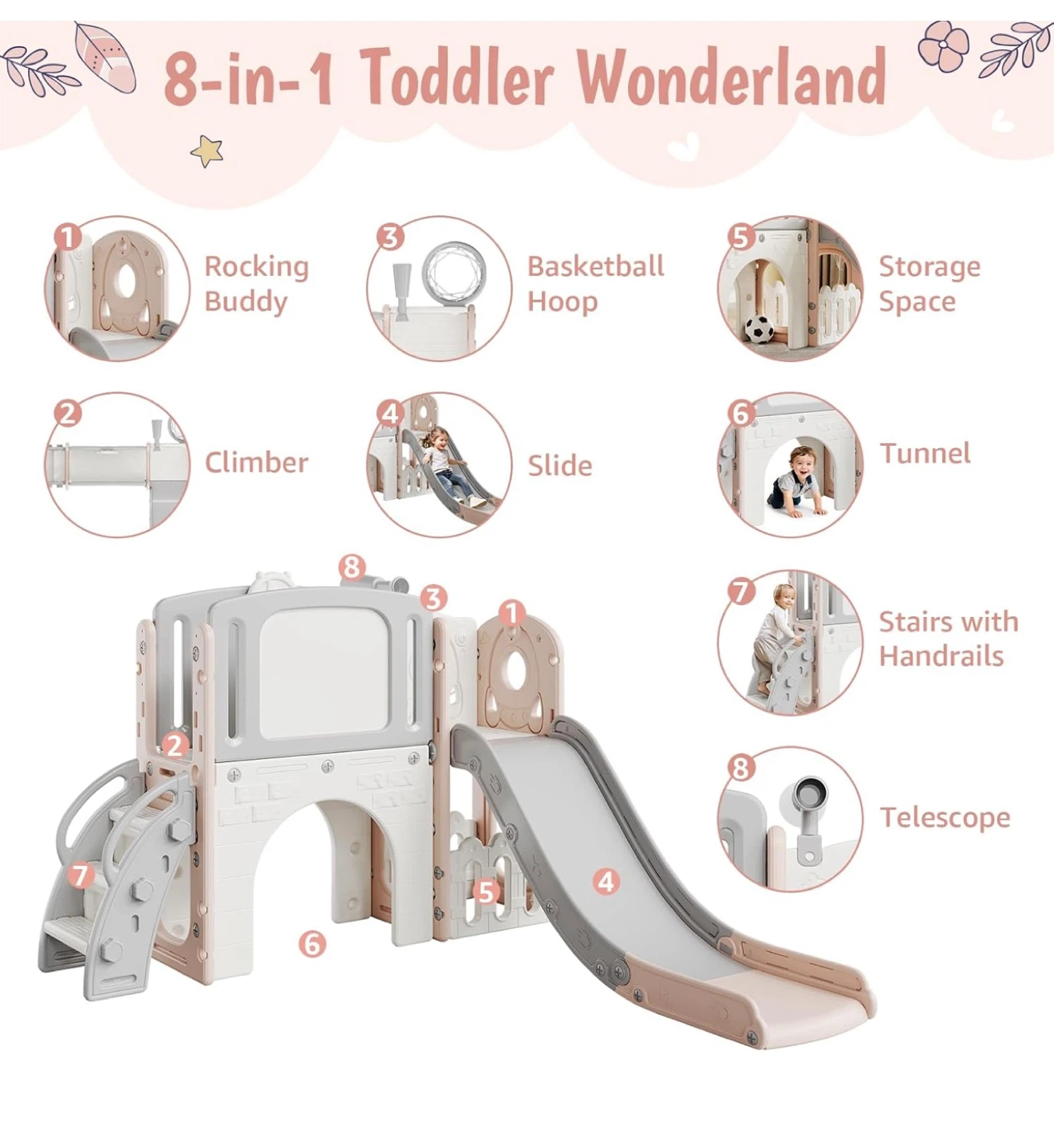 This Patikuin 8-in-1 toddler slide is perfect for endless fun! It combines eight exciting activities in one, including a smooth slide, climber, tunnel, basketball hoop, rocking buddy, telescope, stairs with handrails, and a storage area.