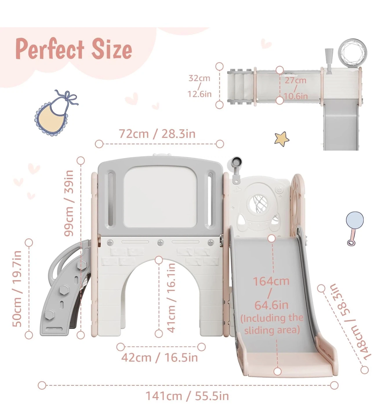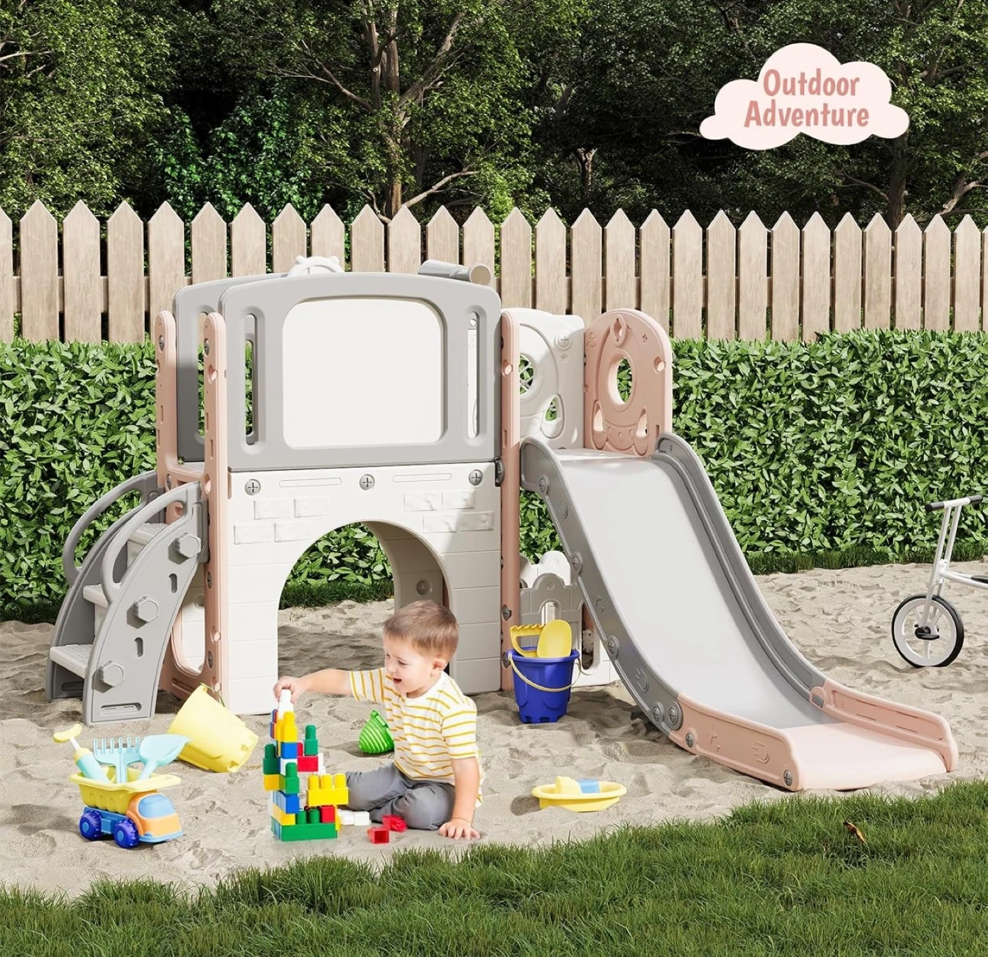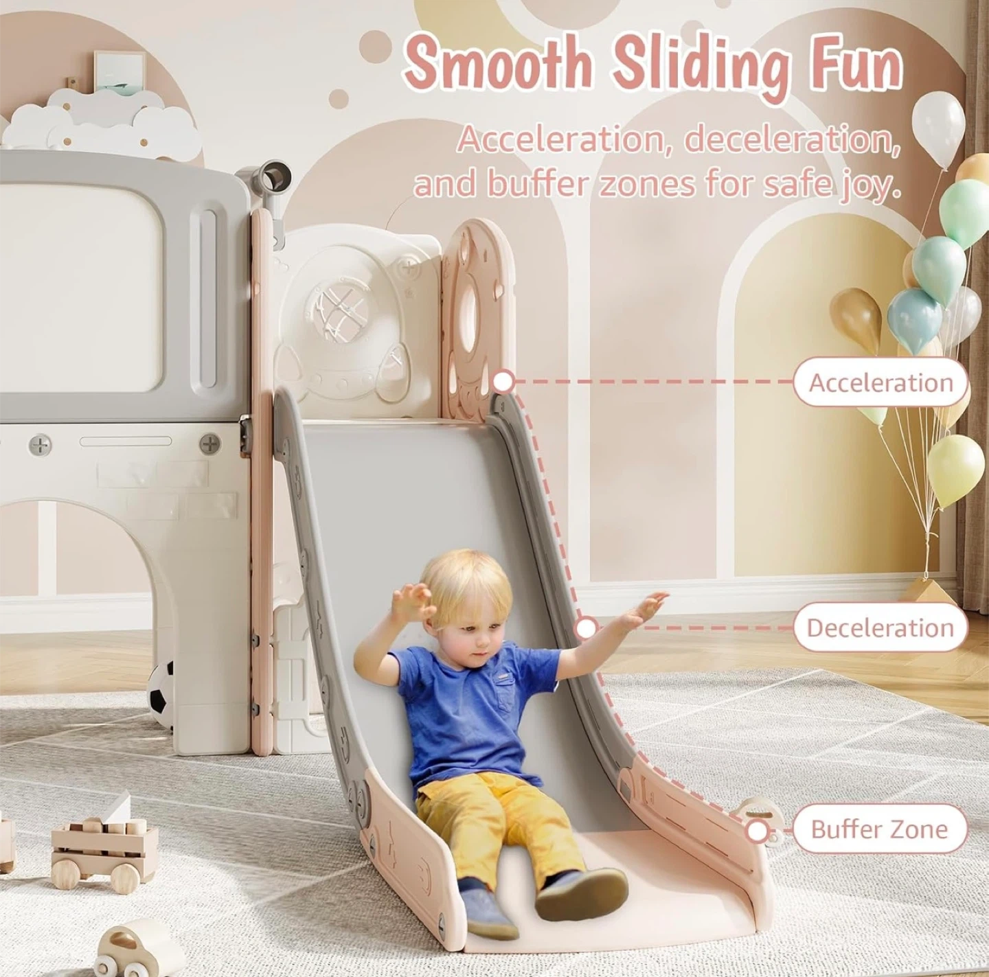 This Patikuin 8-in-1 toddler slide is perfect for endless fun! It combines eight exciting activities in one, including a smooth slide, climber, tunnel, basketball hoop, rocking buddy, telescope, stairs with handrails, and a storage area.