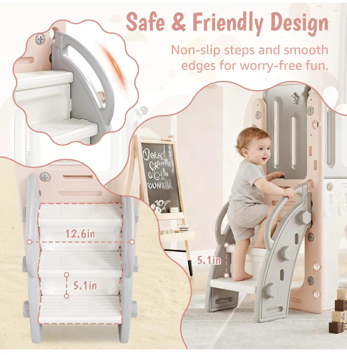 Designed with your child's safety in mind, this set features rounded edges, non-slip steps, and ergonomic handrails to ensure every climb is stable and comfortable. It's made from durable, non-toxic HDPE material, making it sturdy and built to last!