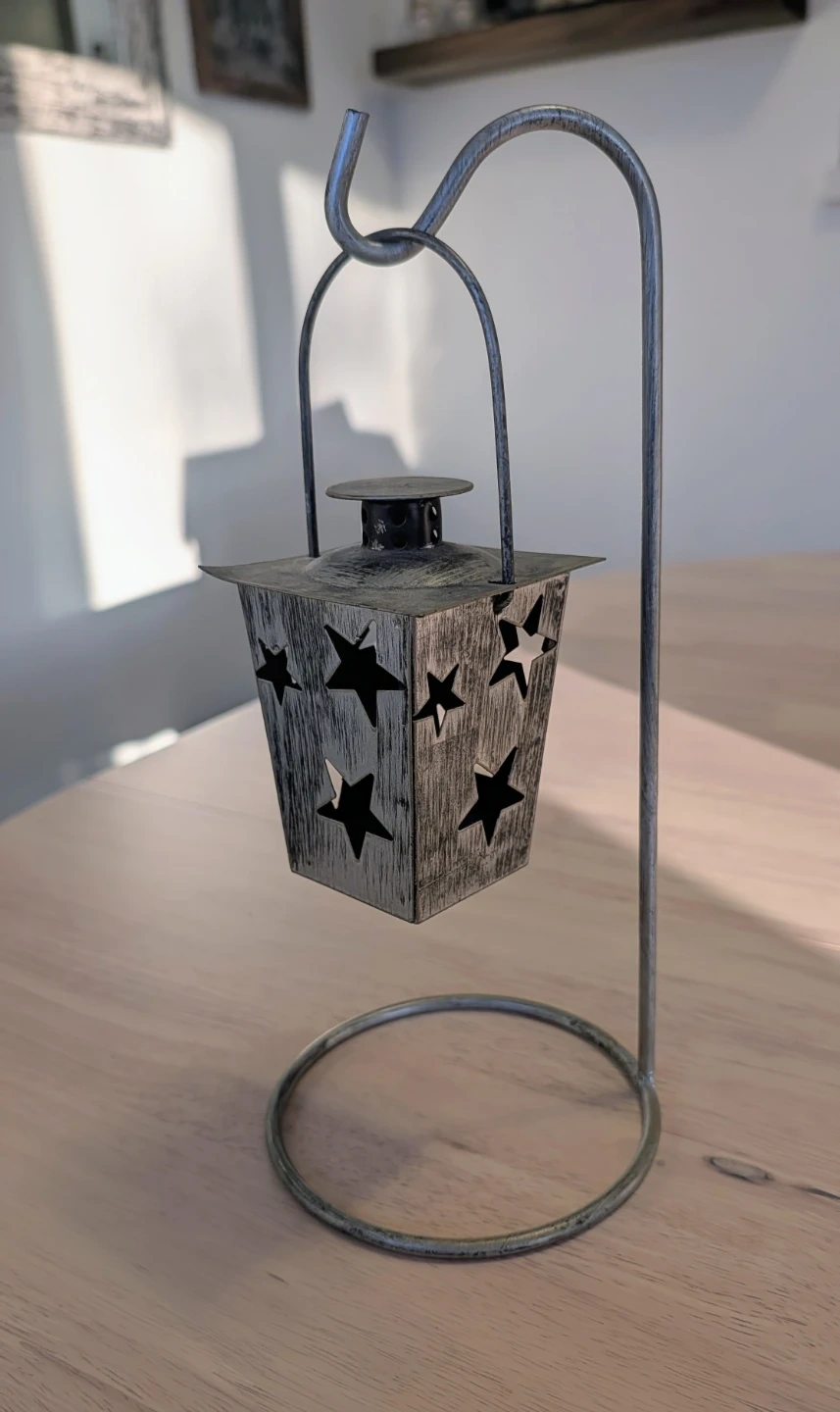 This is a cute star tealight candle lantern on a metal stand. It would be perfect for adding a bit of light to your home or patio.