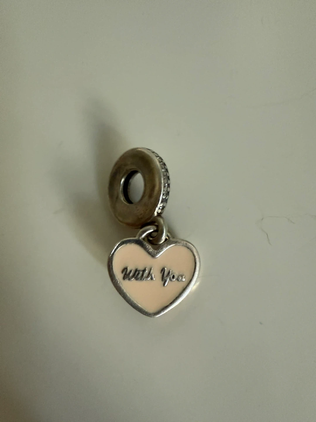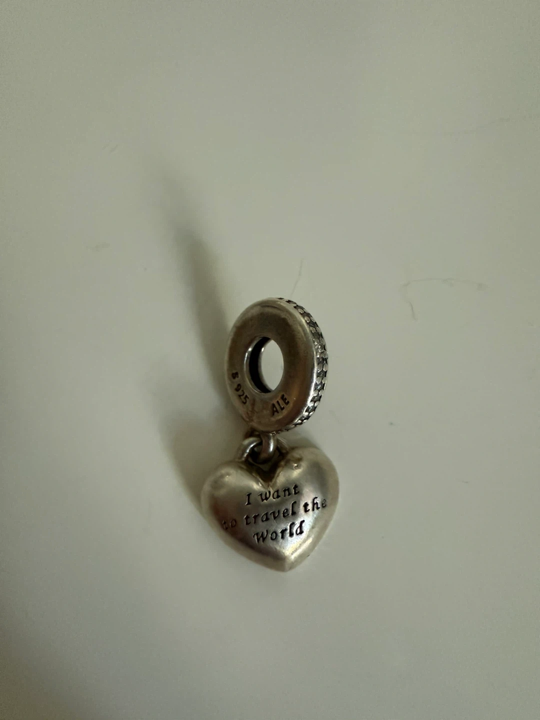 Selling a Pandora heart dangle charm. One side says "with you" and the other side says "I want to travel the world"