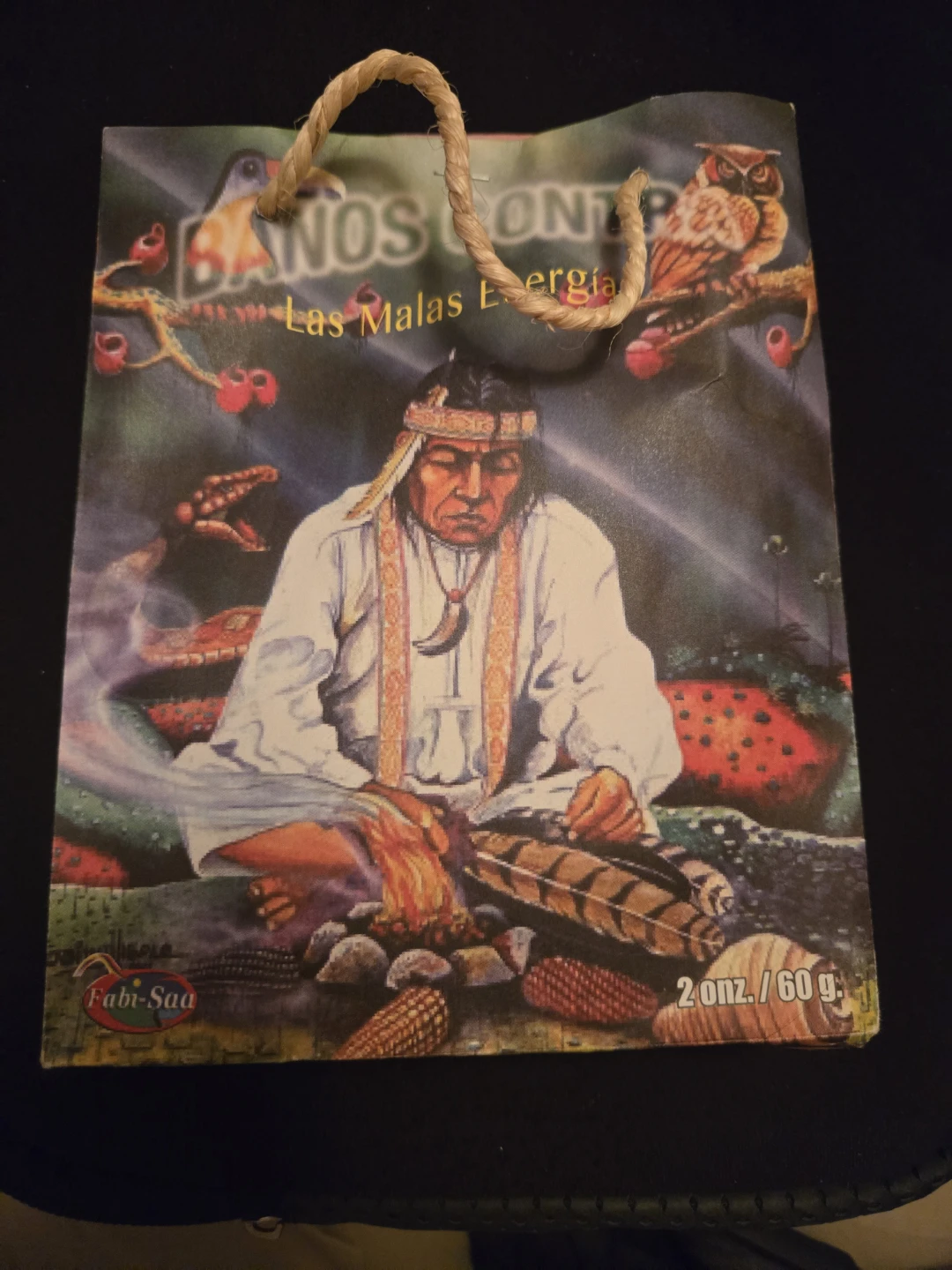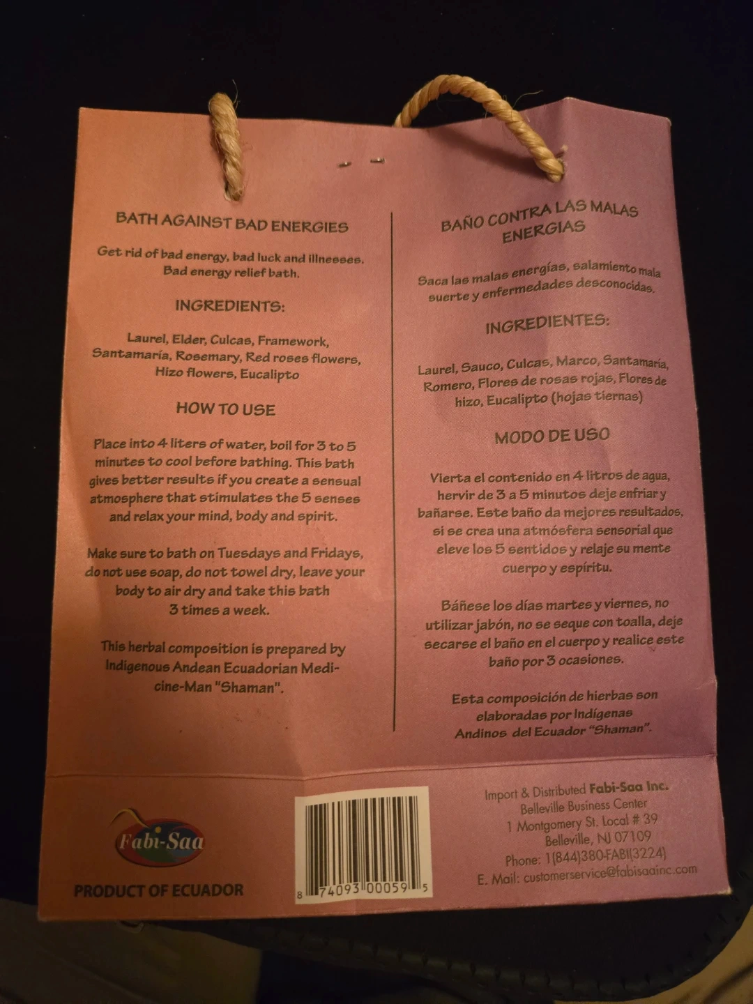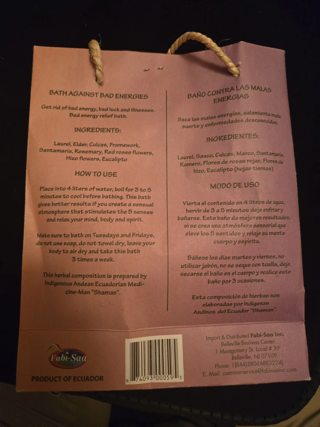Gag gift for your down and out friend, lover, or family member: "Get rid of bad energy, bad luck, and illnesses with this bath against bad energies...." It's a bad energy relief bath with ingredients including laurel, elder, culcas, framework, santamaria, rosemary, red roses flowers, hino, eucalipto. This herbal composition is allegedly prepared by Indigenous Andean Ecuadorian Medicine-man "Shaman".
