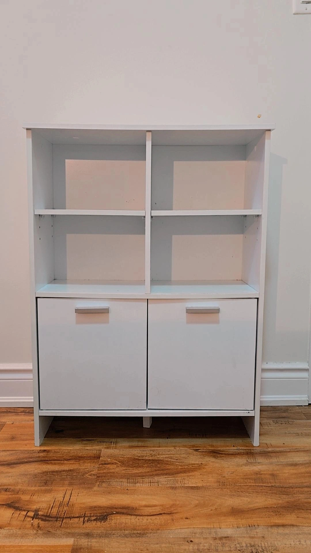 Selling a white Shelf with two doors at the bottom. It's in great shape and perfect for storing books or displaying items. A great addition to any room!