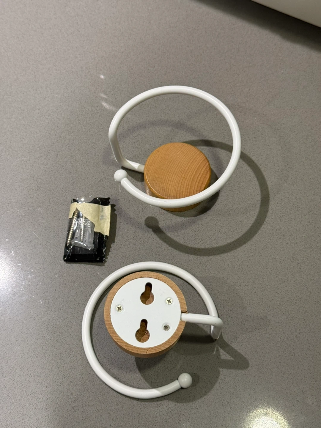 Here's a set of two Umbra Loft wall hooks! They feature a white metal loop and a wooden base. Included are the screws for mounting. These are great for adding a touch of modern style to your entryway or closet
