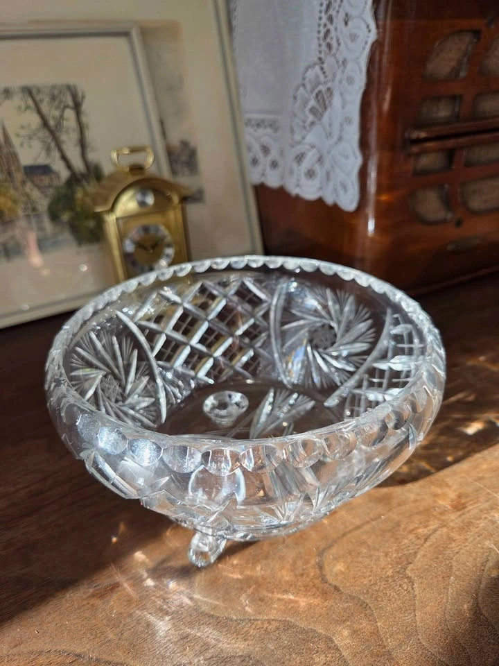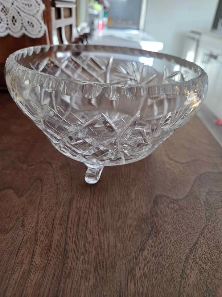 This is a gorgeous, vintage cut glass bowl that I inherited. It is a perfect size for a fruit bowl or any kind of dish you want to entertain with. It is very heavy and sturdy. This dish will make any area in your house look classy and elegant.