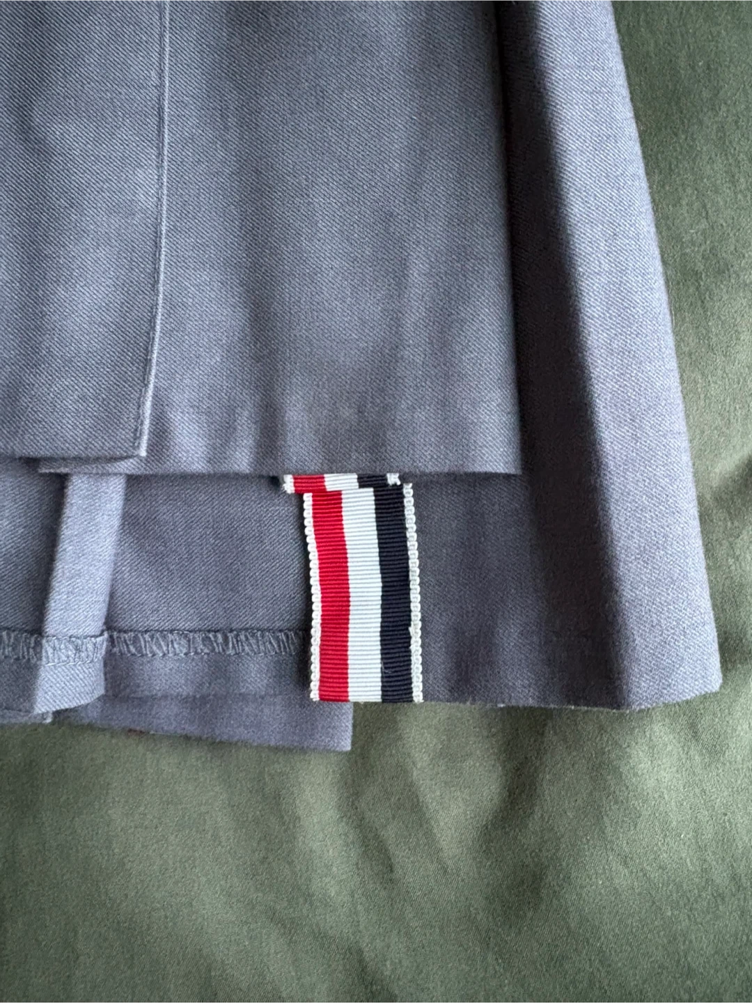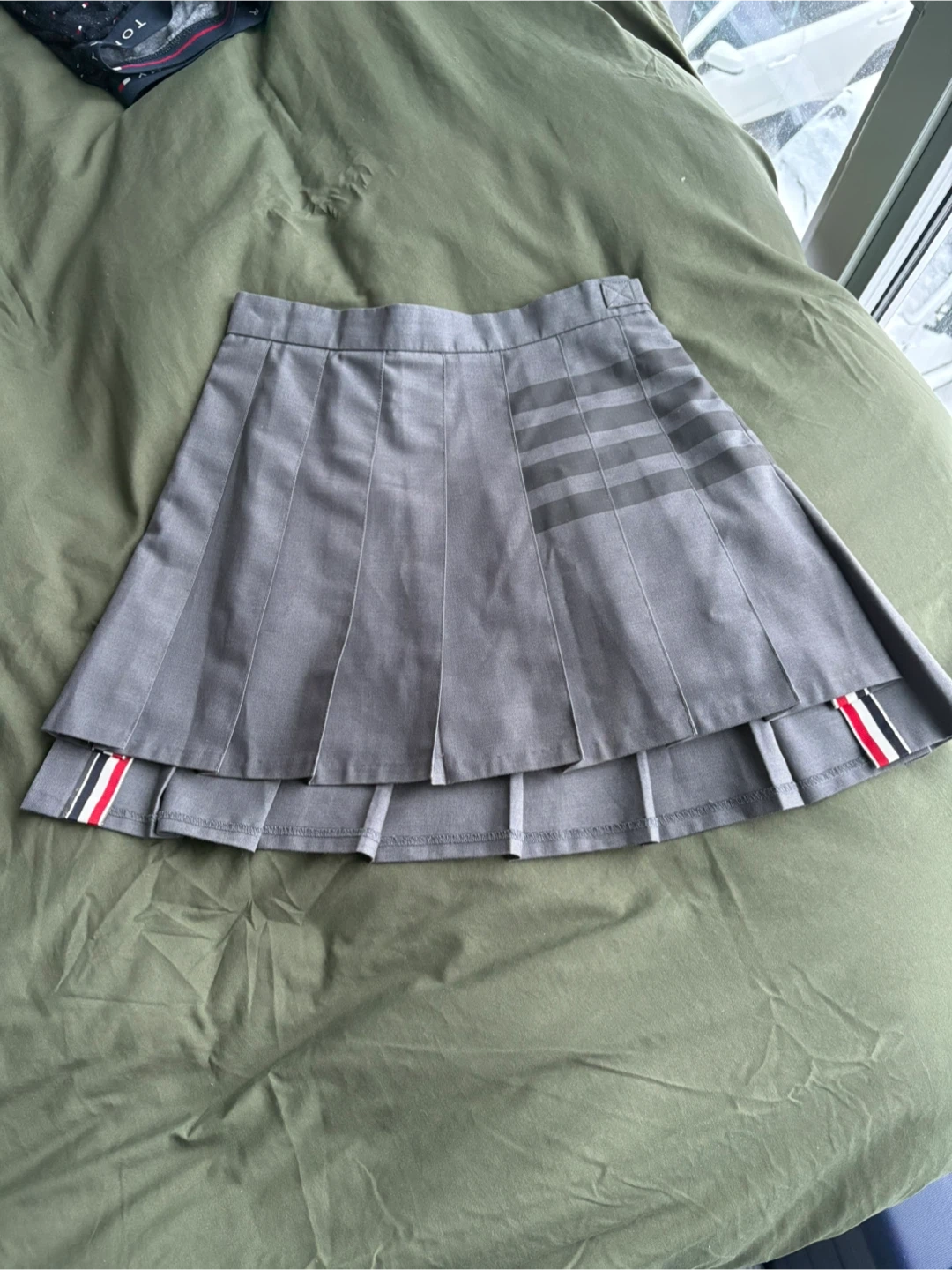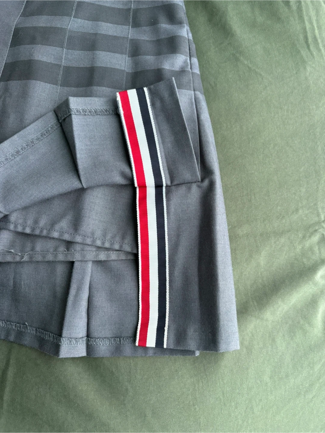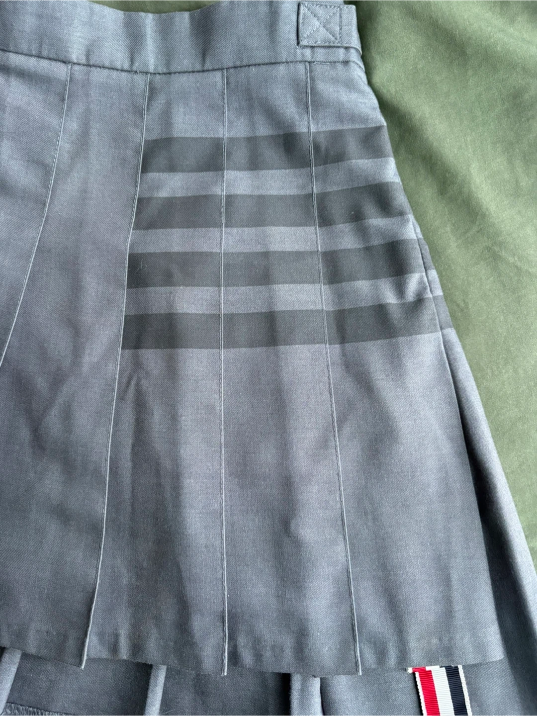 Selling a Thom Browne pleated skirt in a stylish grey colour! It features the iconic Thom Browne stripes and tricolour grosgrain loop tab. This skirt is perfect for adding a touch of sophistication to your wardrobe